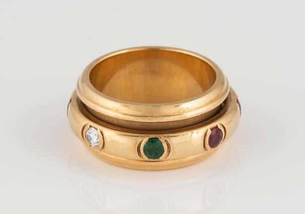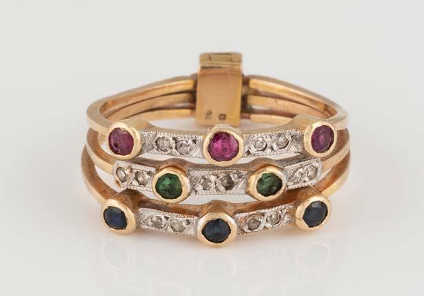 Gelbgold, Weißgold. Ringmaß ca. 53, Ges.-Gew. ca. 4,2 g. Gest. und geprüft 585 bzw. 14 K. Dreigliedriger Ring (möglicherweise Marriage), besetzt mit kleinen Saphire, Rubinen, Smaragden und Diamanten. Schiene gedrückt, Tragespuren.
