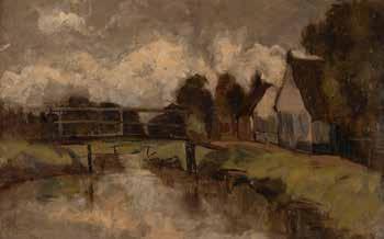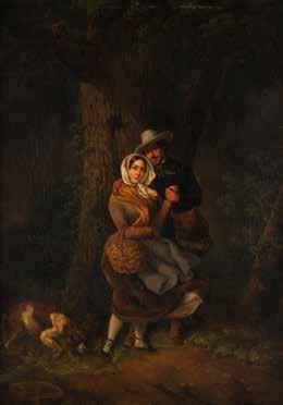 Oil lacquer painting on papier-mâché, on panel. 20,5 x 24.5 cm (F. 32 x 37 cm). Bottom indistinctly inscribed 'Rustic ...'. Craquelure, upper left small chip. Frame.