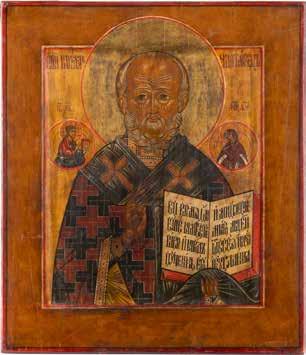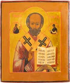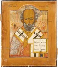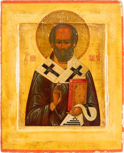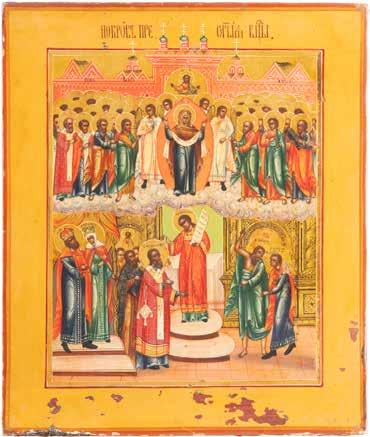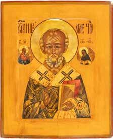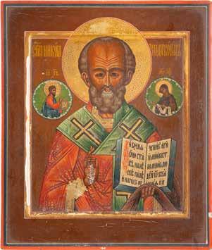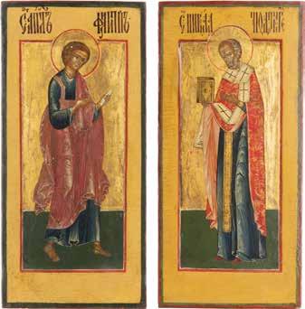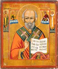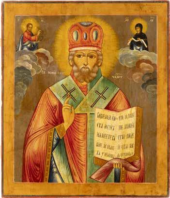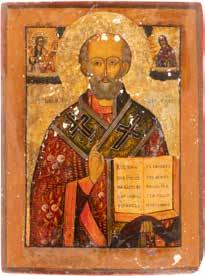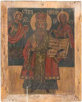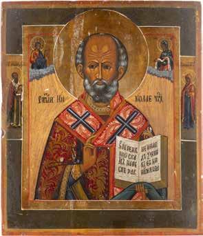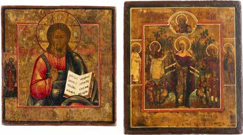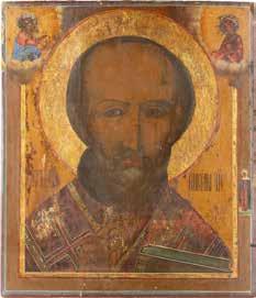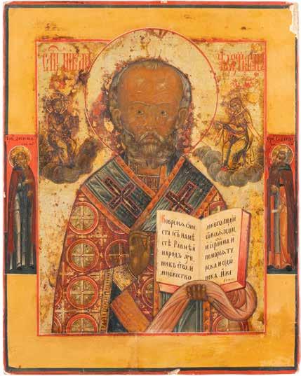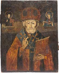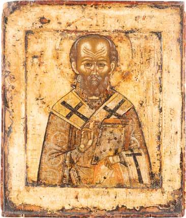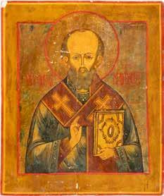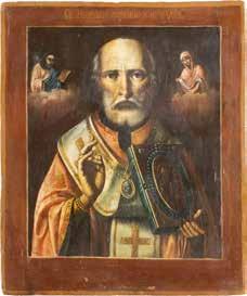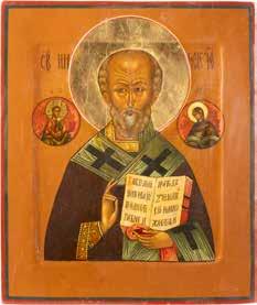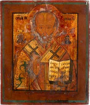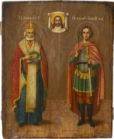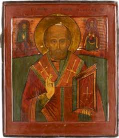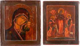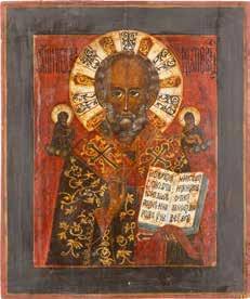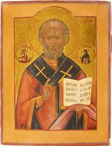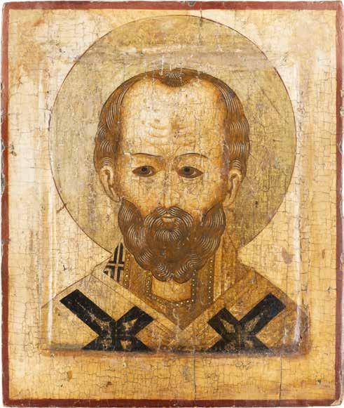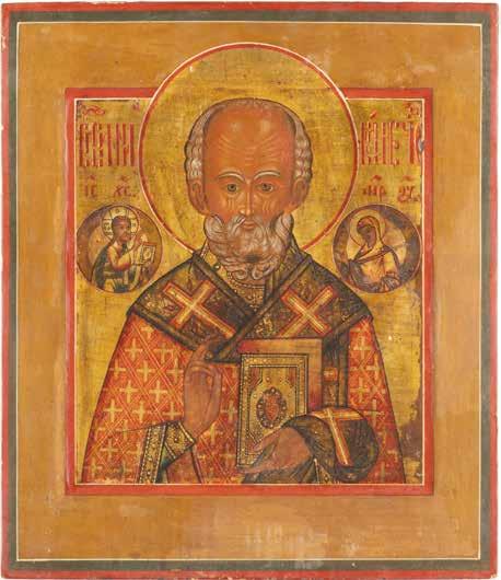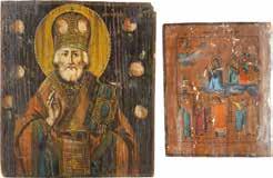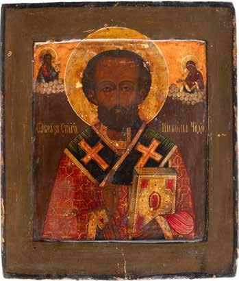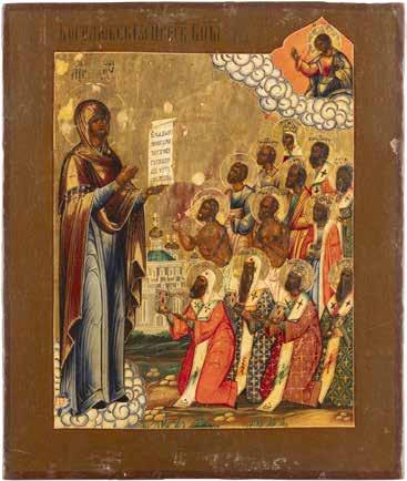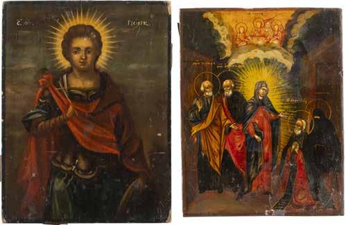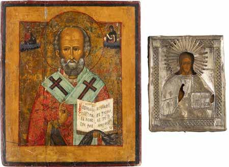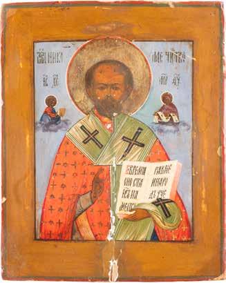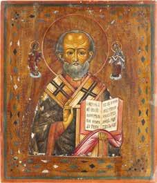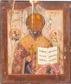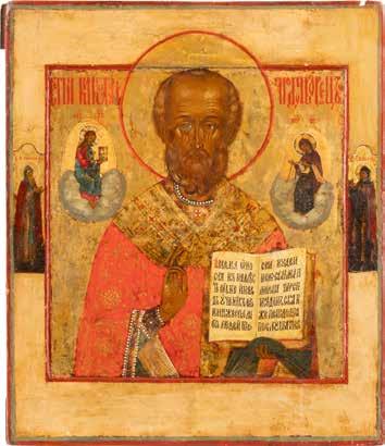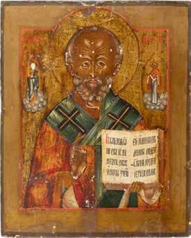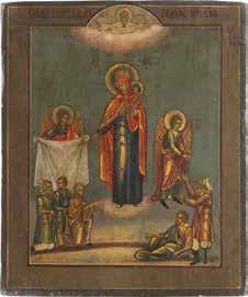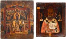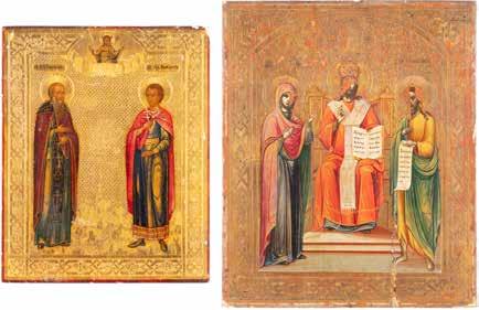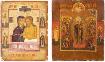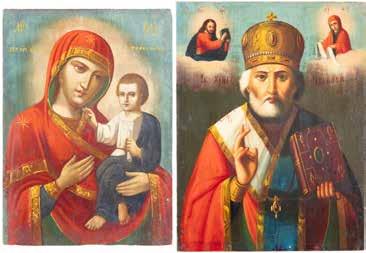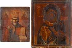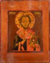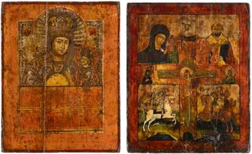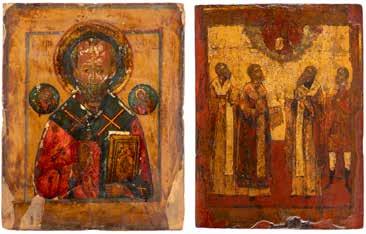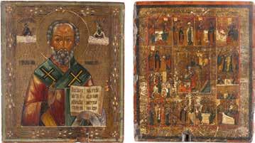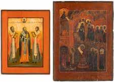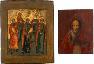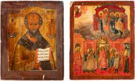 TWO ICONS SHOWING ST. NICHOLAS OF MYRA AND THE POKROV Russian, 19th century Tempera on wood panels. Losses. 31.2 x