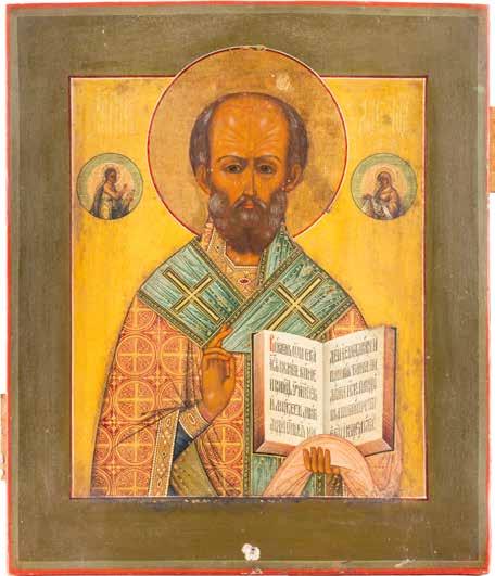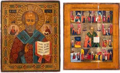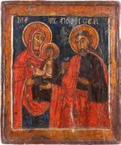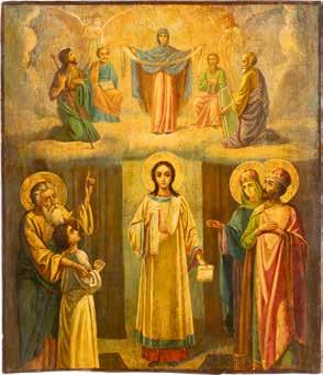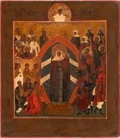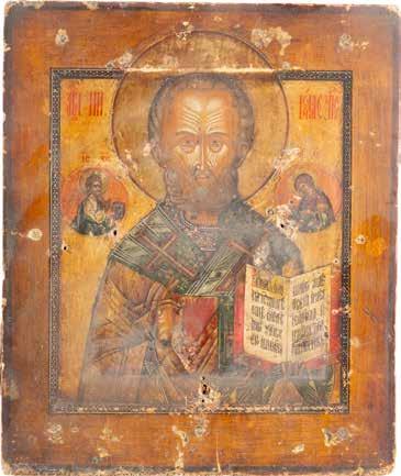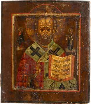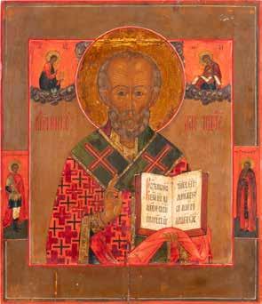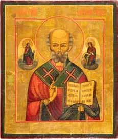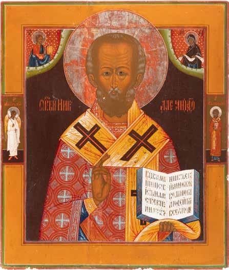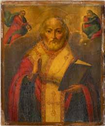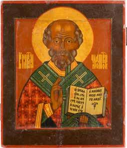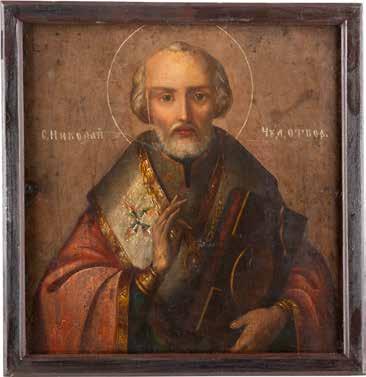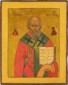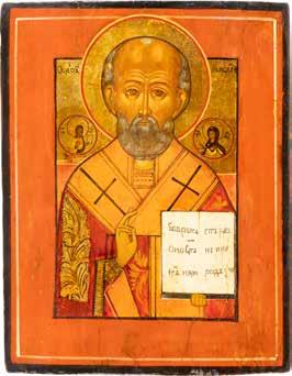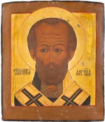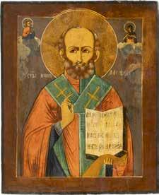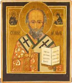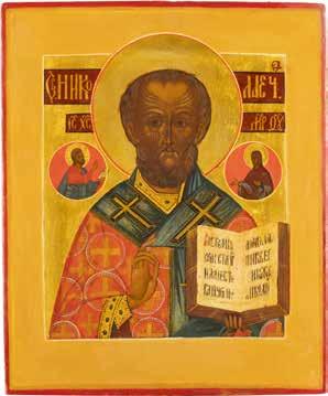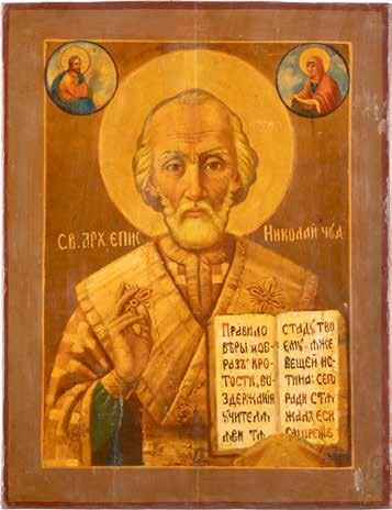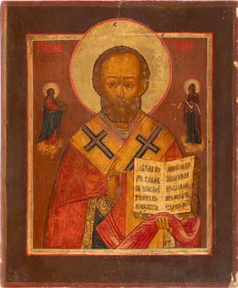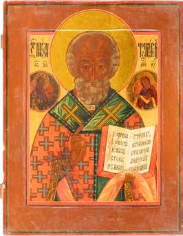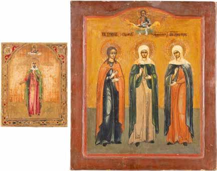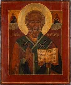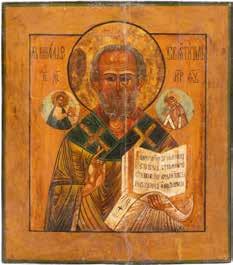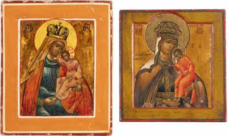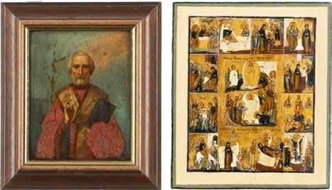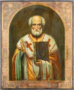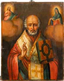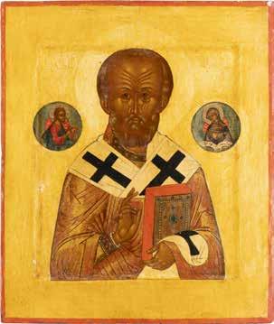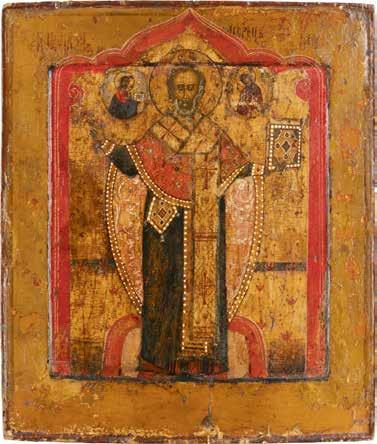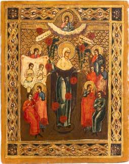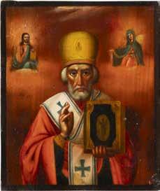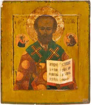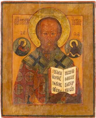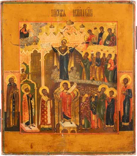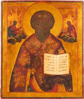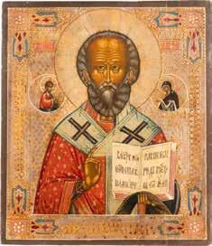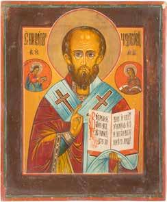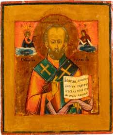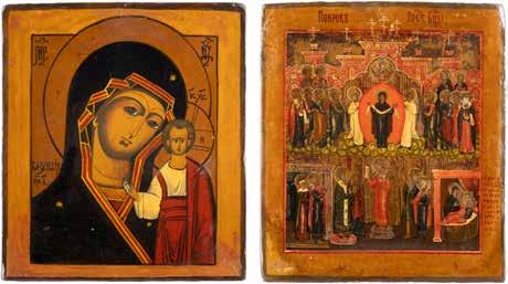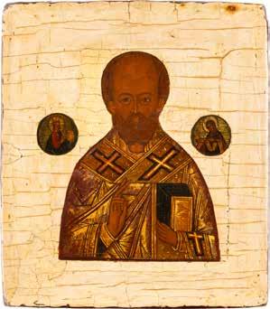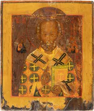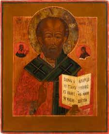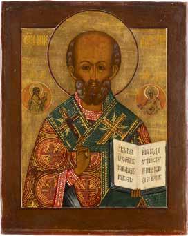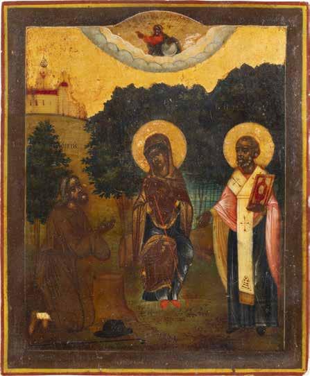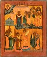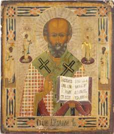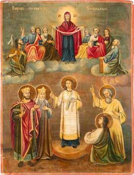 TWO ICONS SHOWING ST. NICHOLAS OF MYRA AND THE POKROV Russian, 19th century Tempera on wood panels. Losses. 31.2 x
