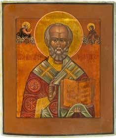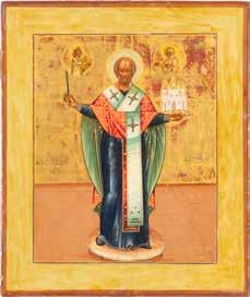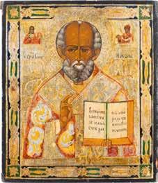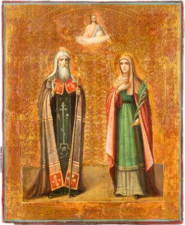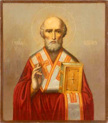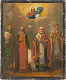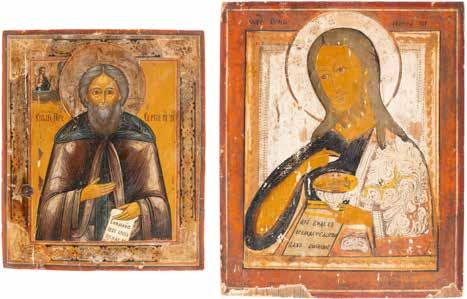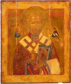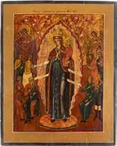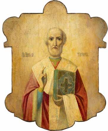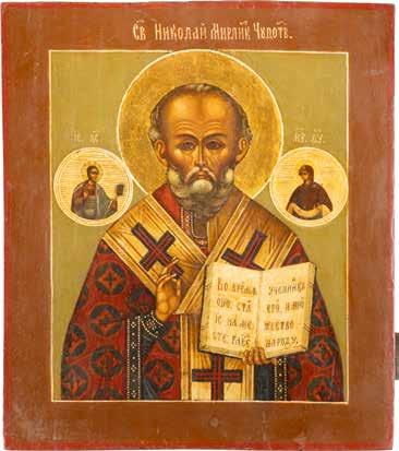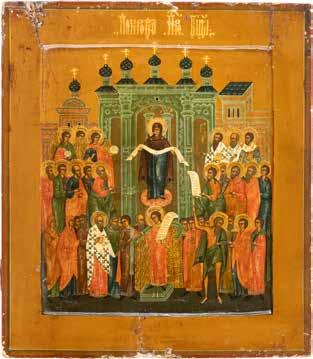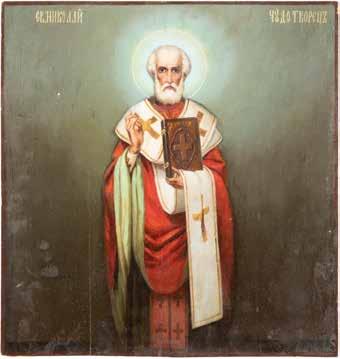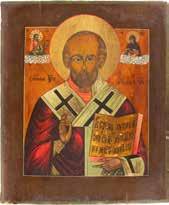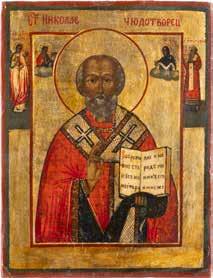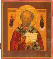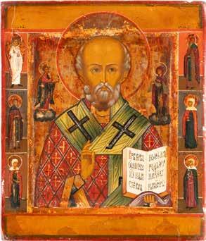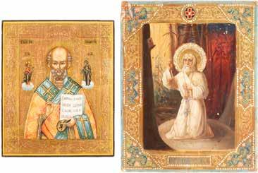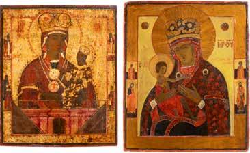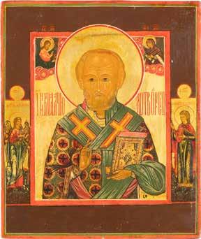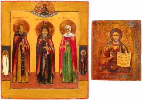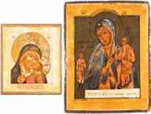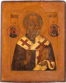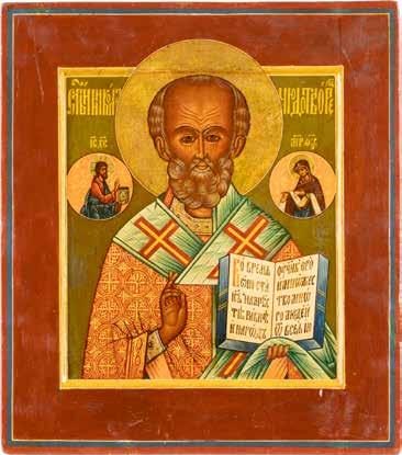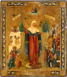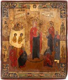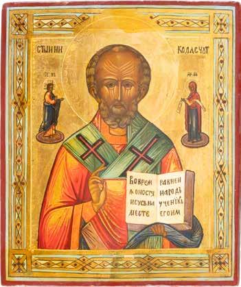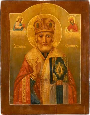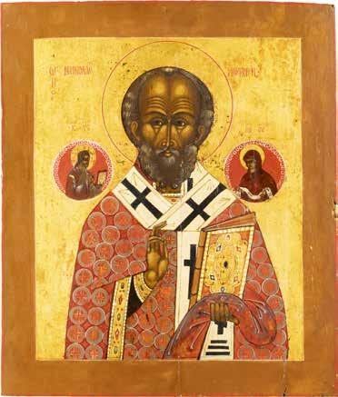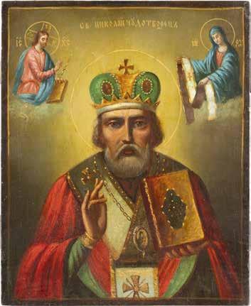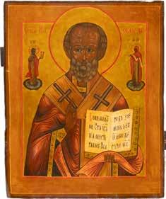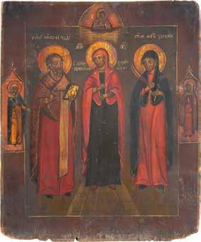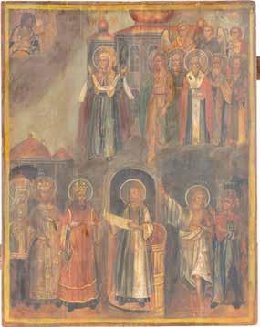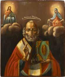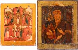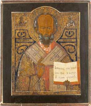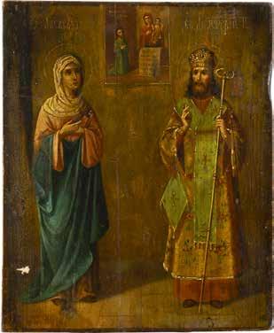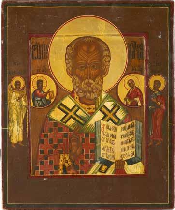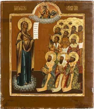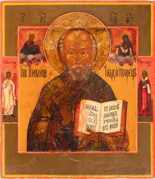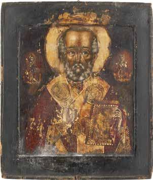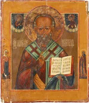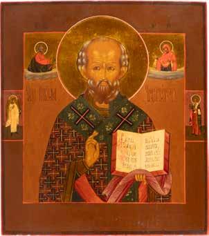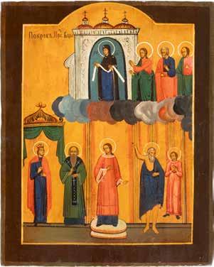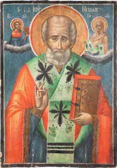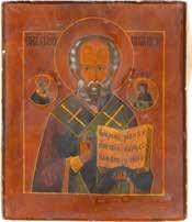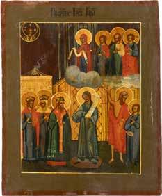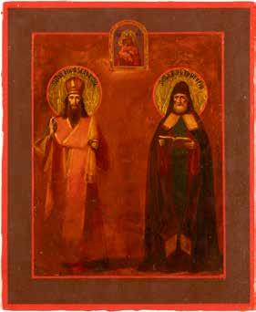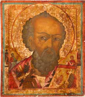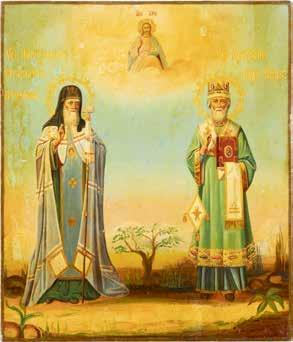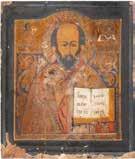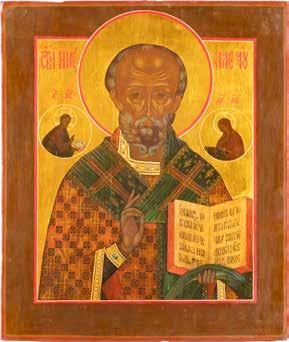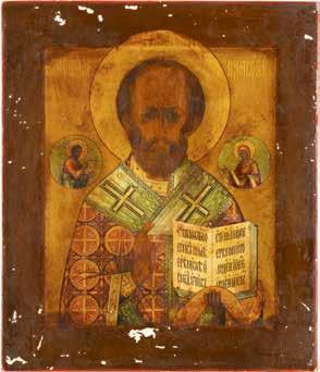 TWO ICONS SHOWING ST. NICHOLAS OF MYRA AND THE POKROV Russian, 19th century Tempera on wood panels. Losses. 31.2 x