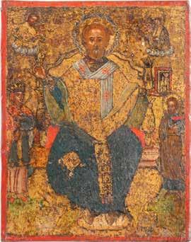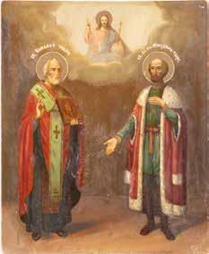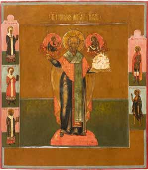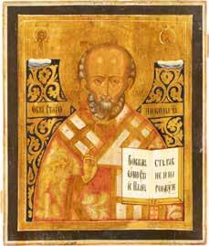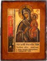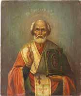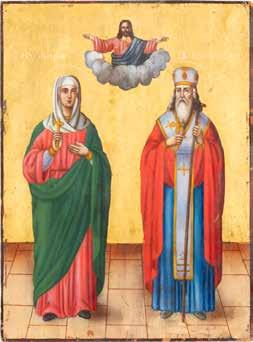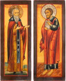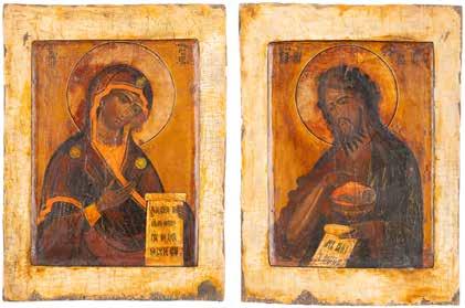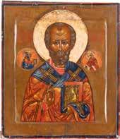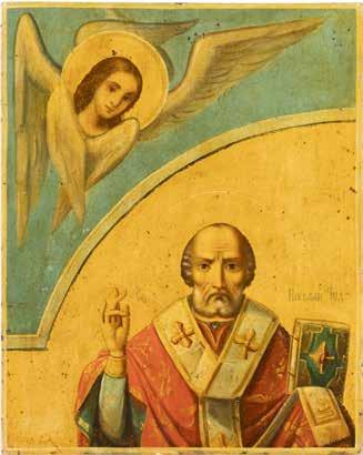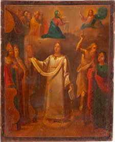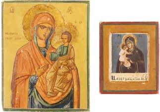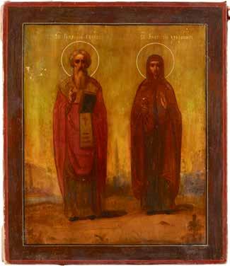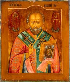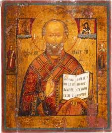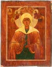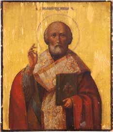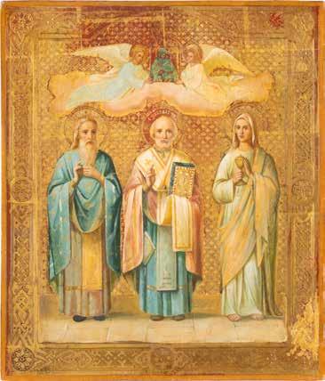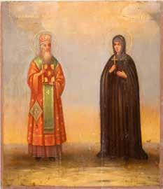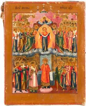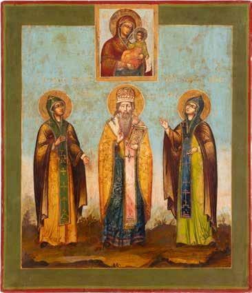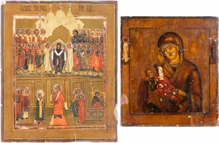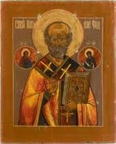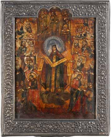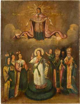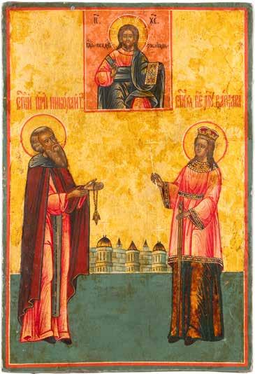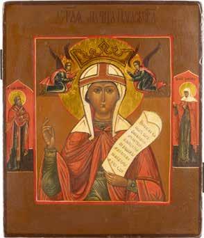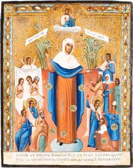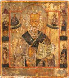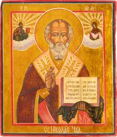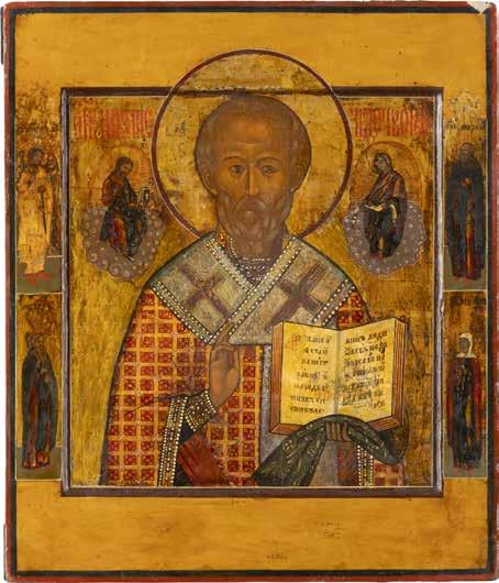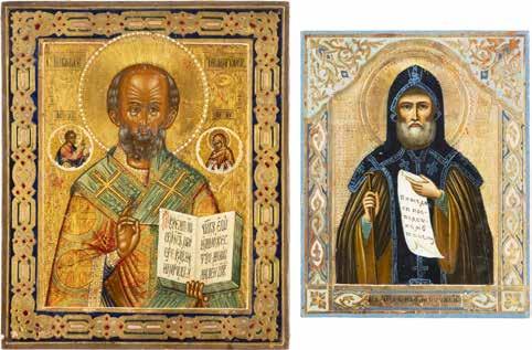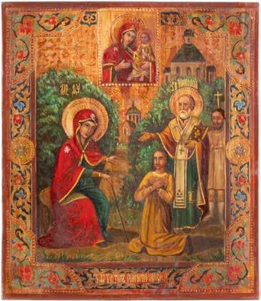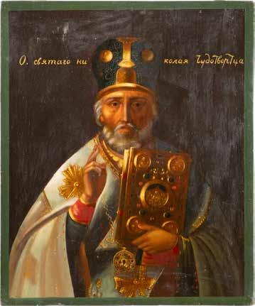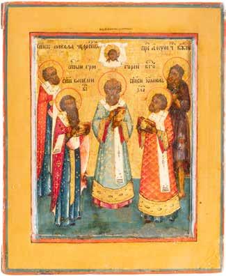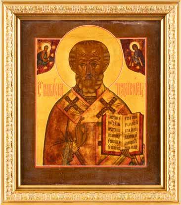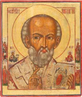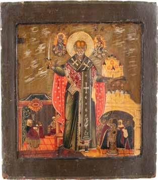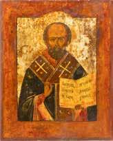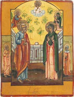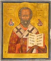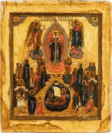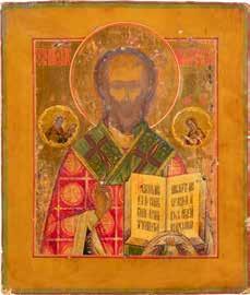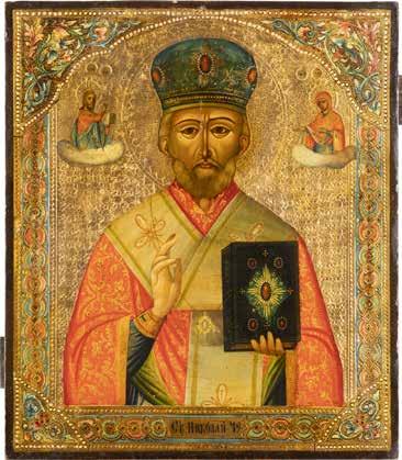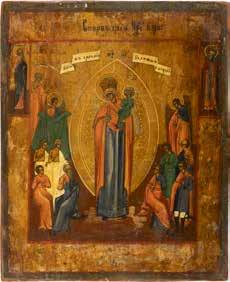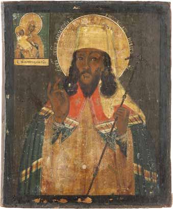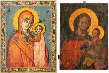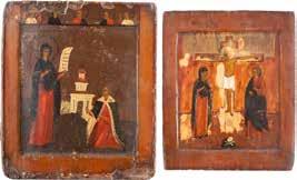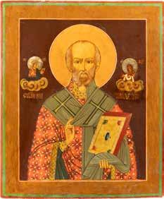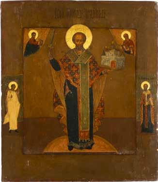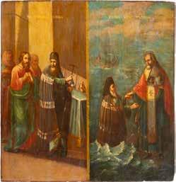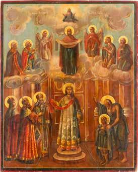 TWO ICONS SHOWING ST. NICHOLAS OF MYRA AND THE POKROV Russian, 19th century Tempera on wood panels. Losses. 31.2 x