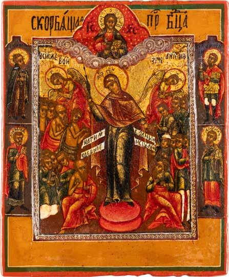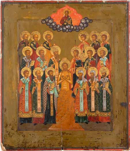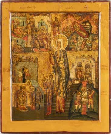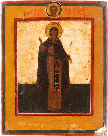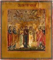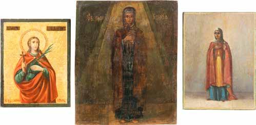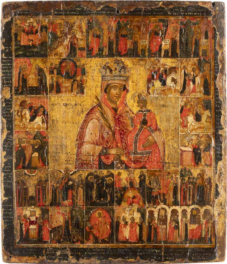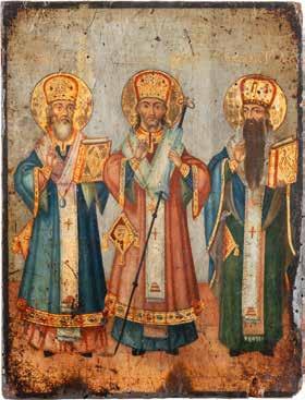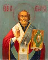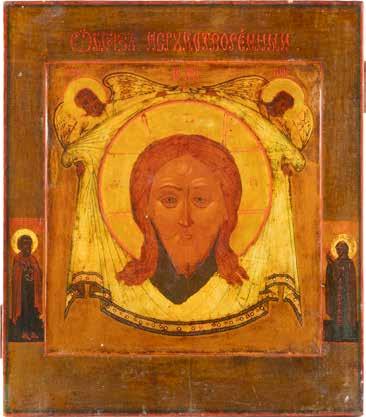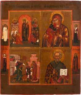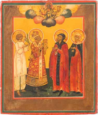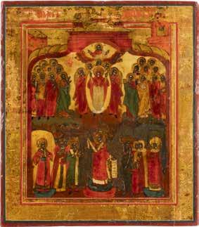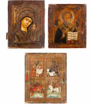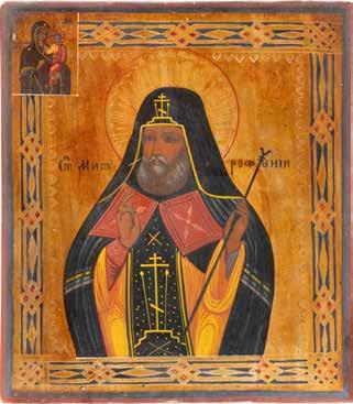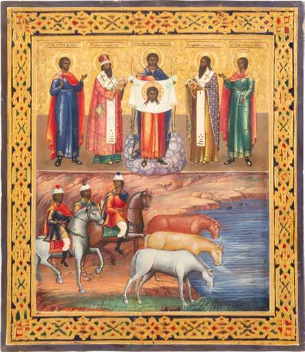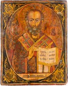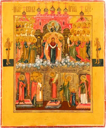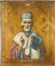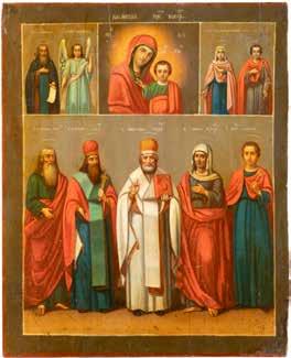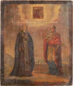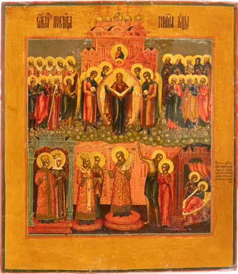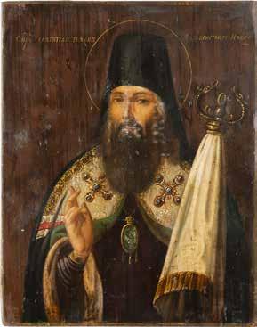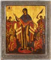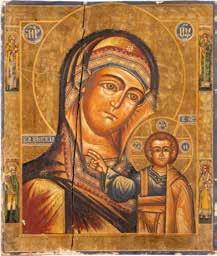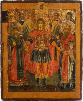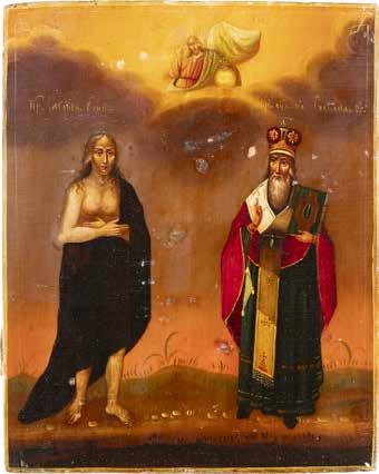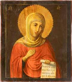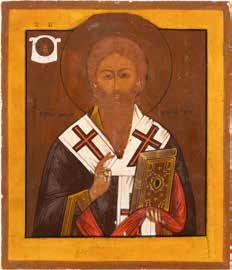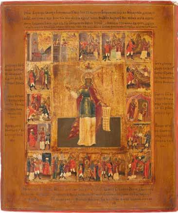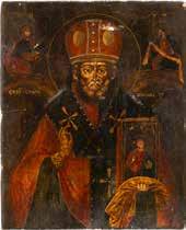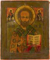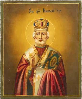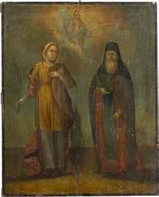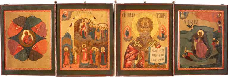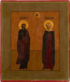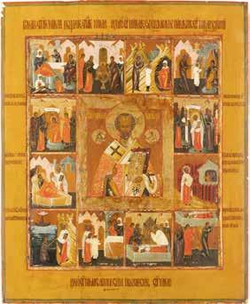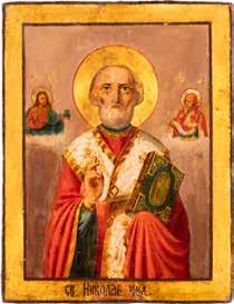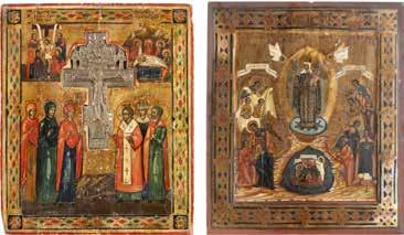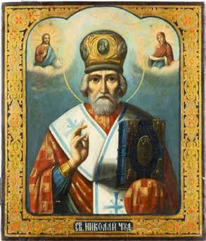 TWO ICONS SHOWING ST. NICHOLAS OF MYRA AND THE POKROV Russian, 19th century Tempera on wood panels. Losses. 31.2 x