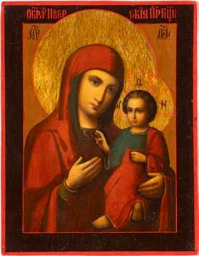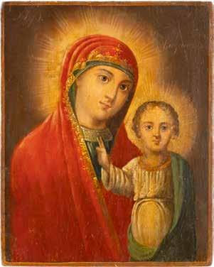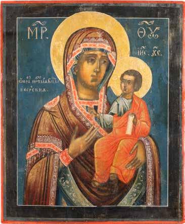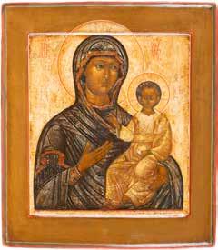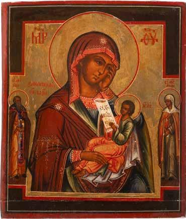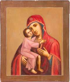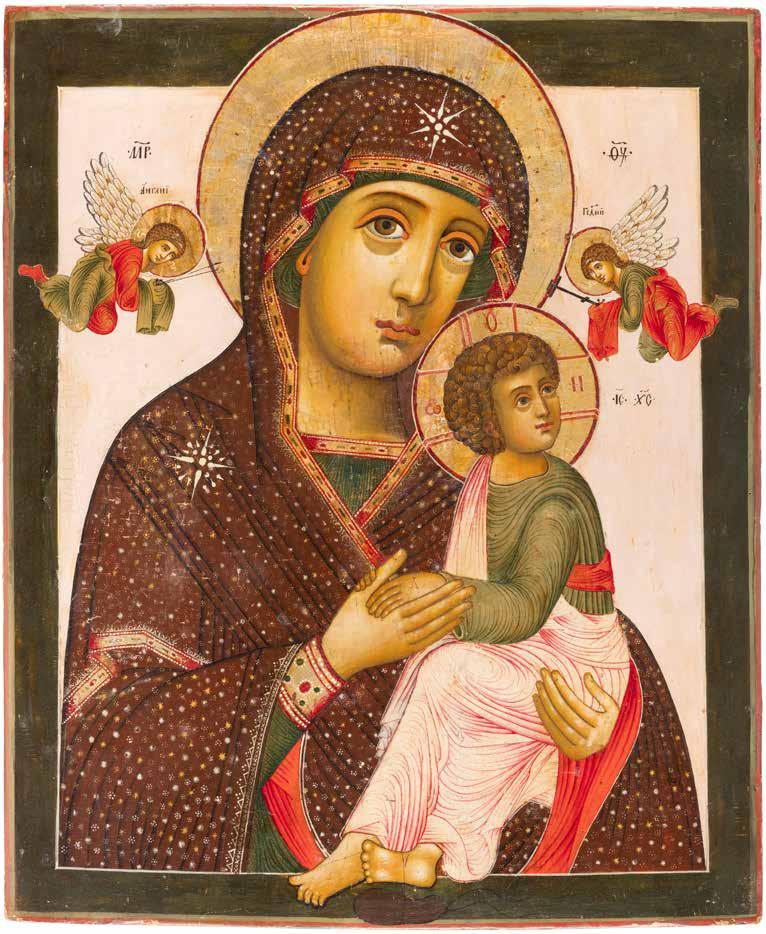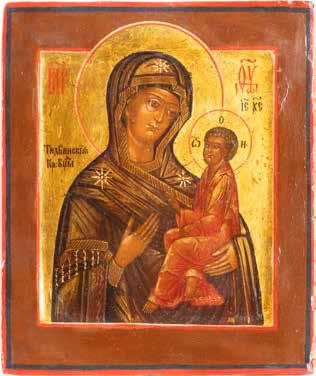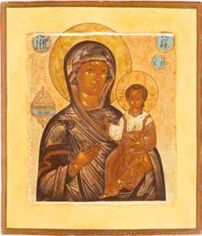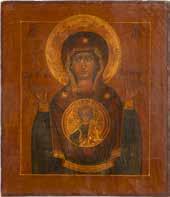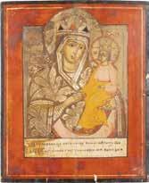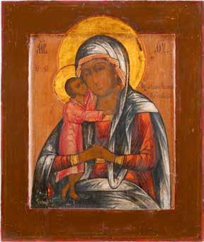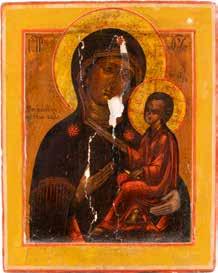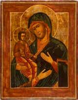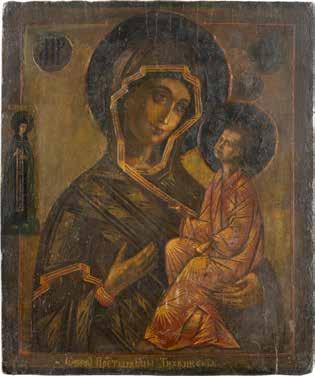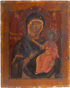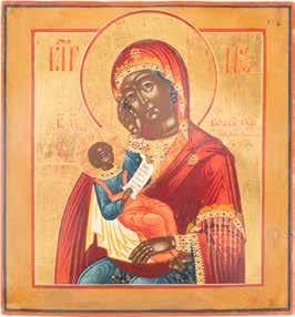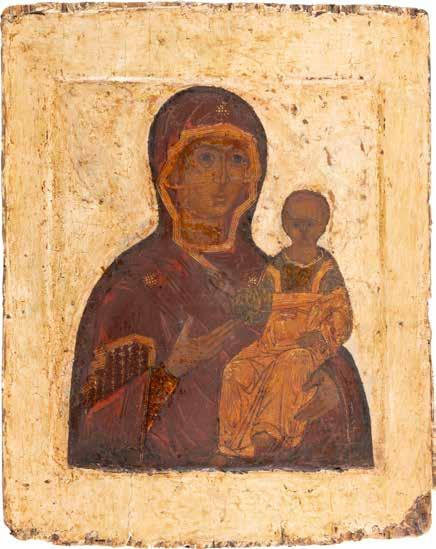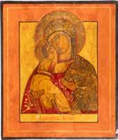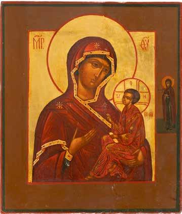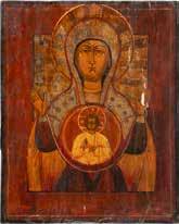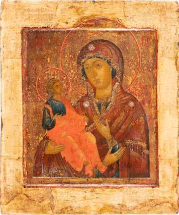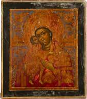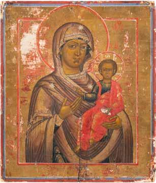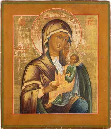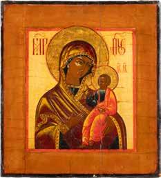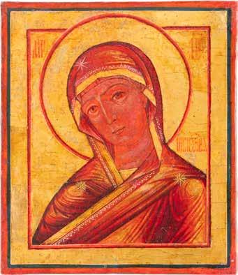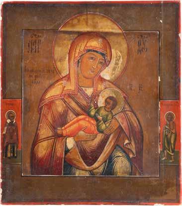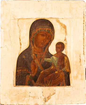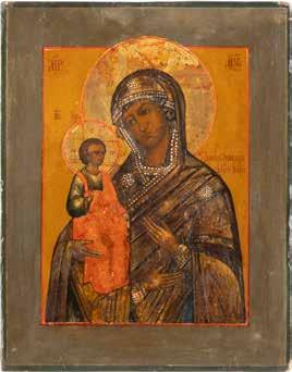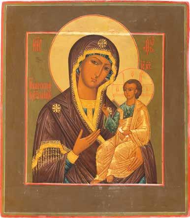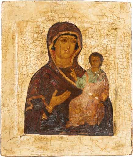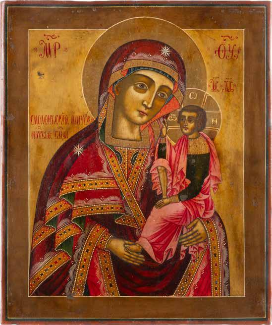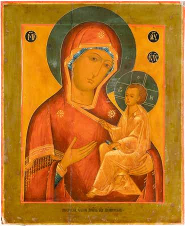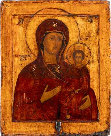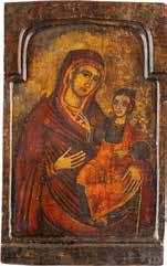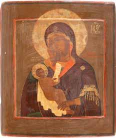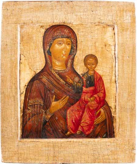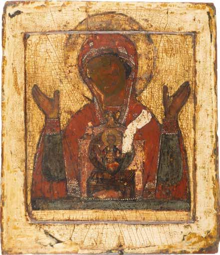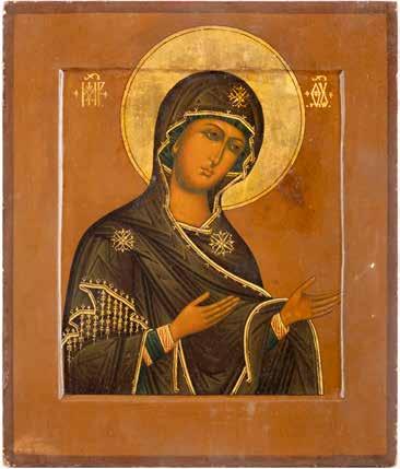 A SMALL ICON SHOWING THE SMOLENSKAYA MOTHER OF GOD Russian, 19th century Tempera on wood panel. Traces of gilding. Partially repainted in recent decades. 22.5 x 17.7 cm (without frame).