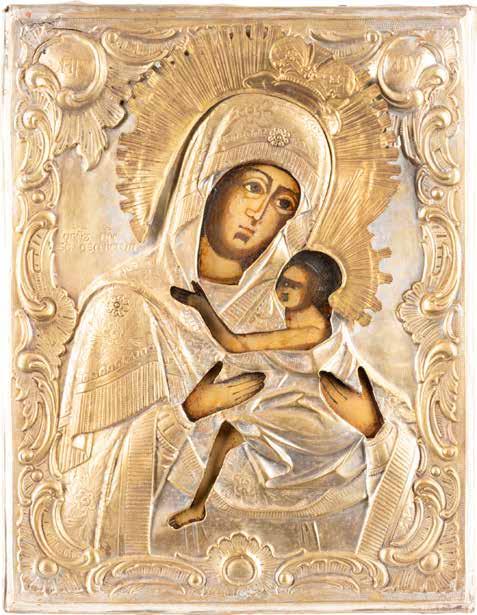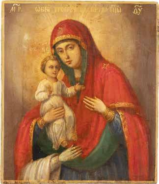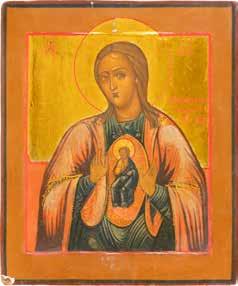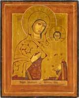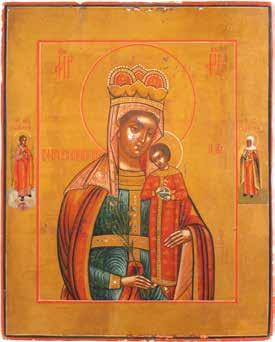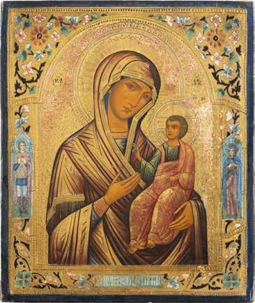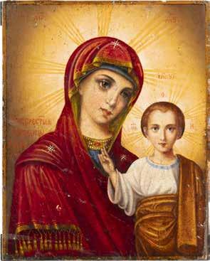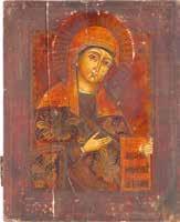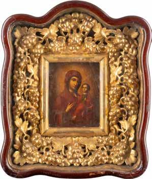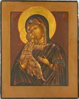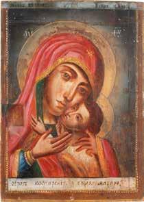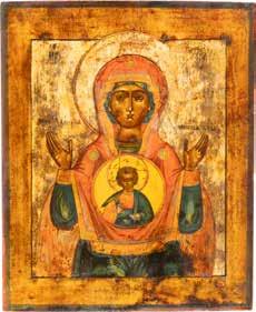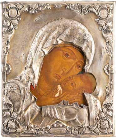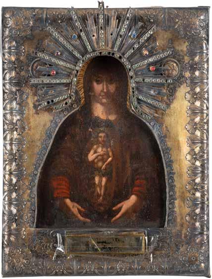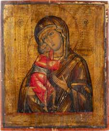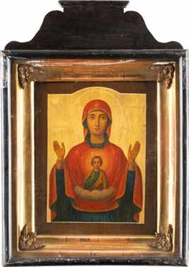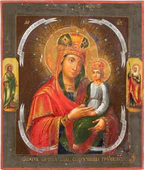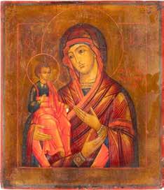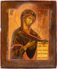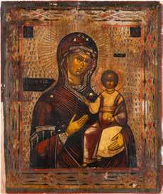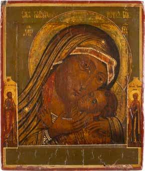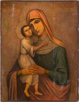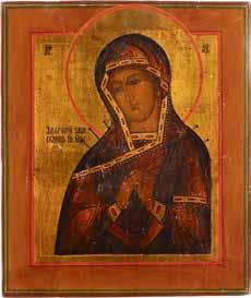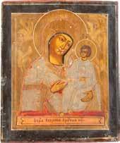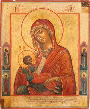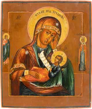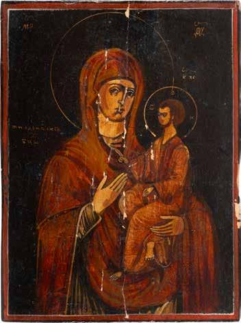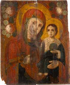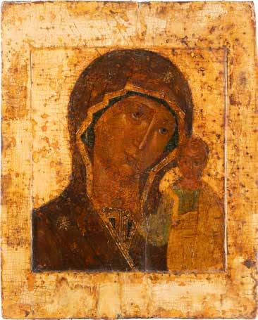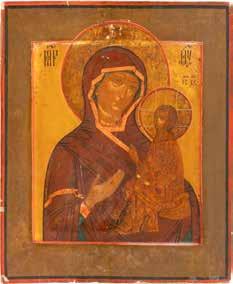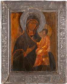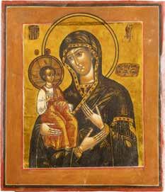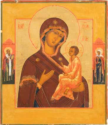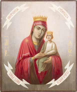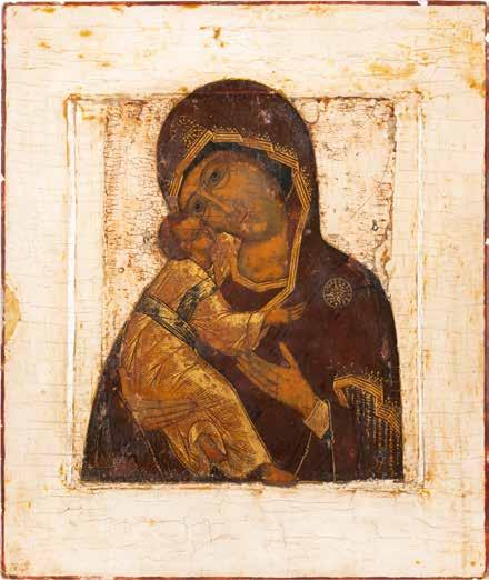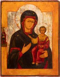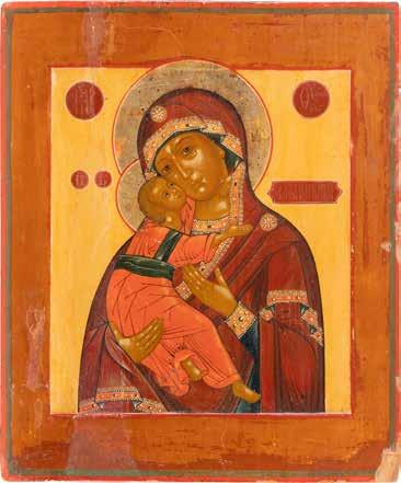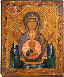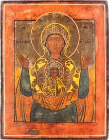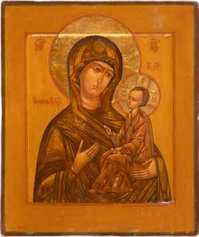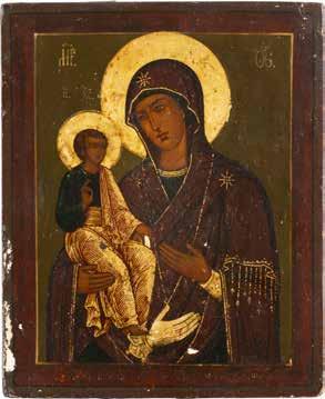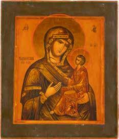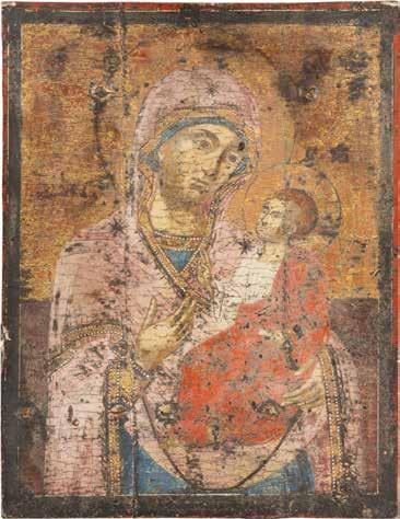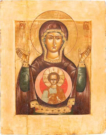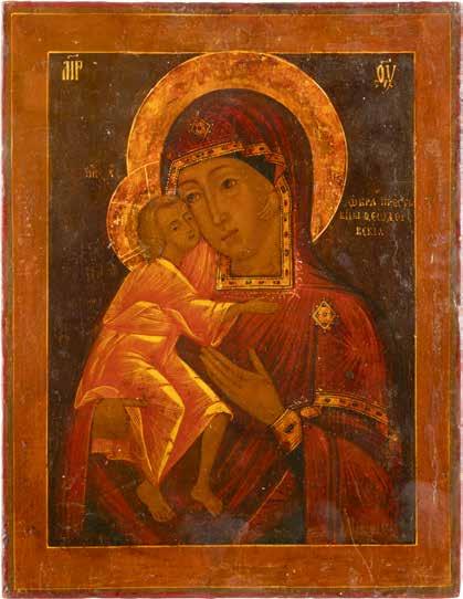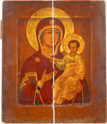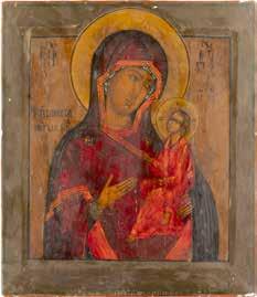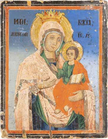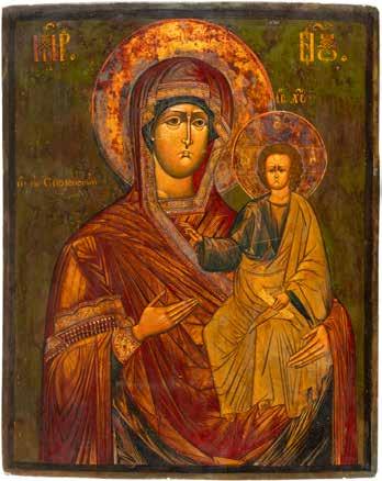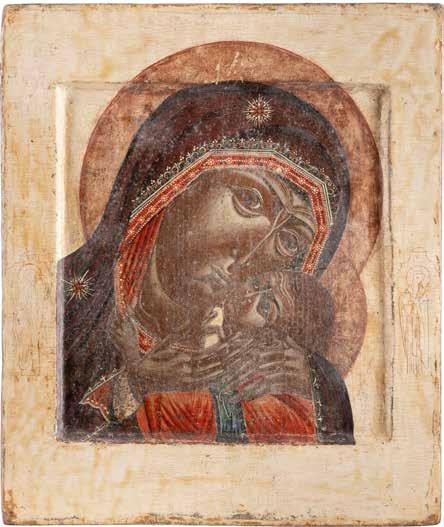 A SMALL ICON SHOWING THE SMOLENSKAYA MOTHER OF GOD Russian, 19th century Tempera on wood panel. Traces of gilding. Partially repainted in recent decades. 22.5 x 17.7 cm (without frame).