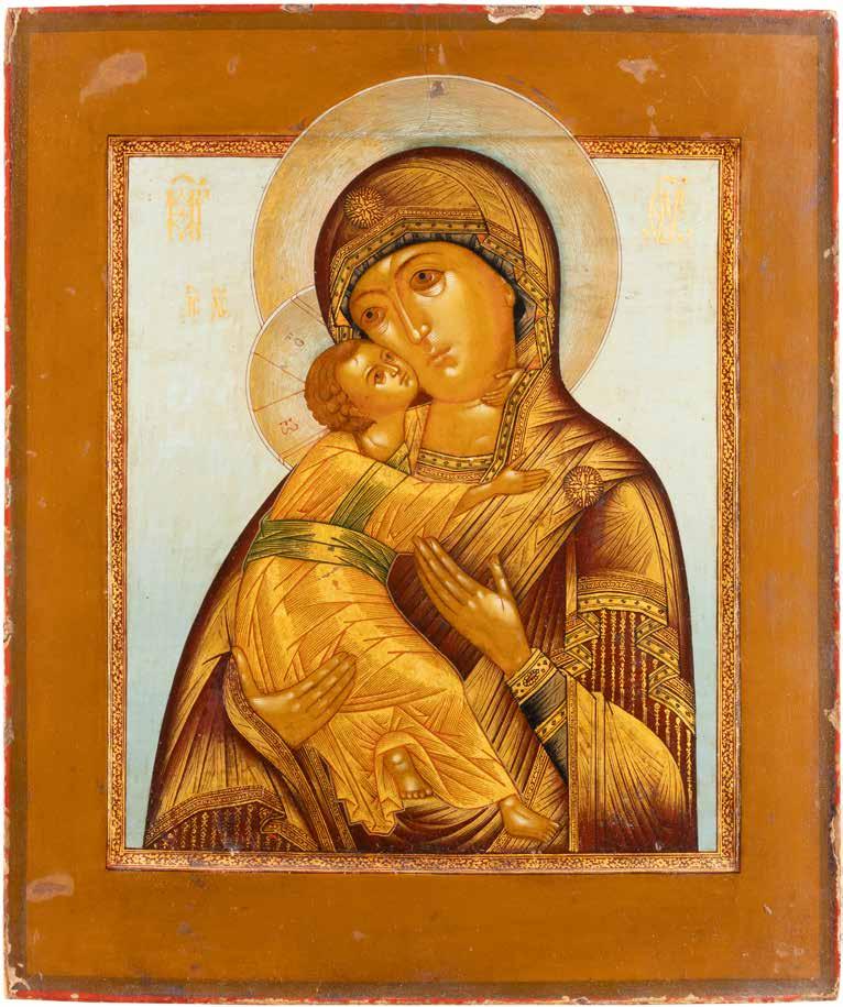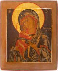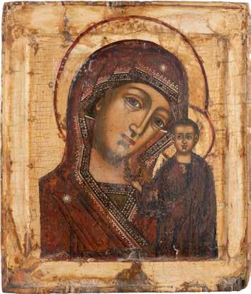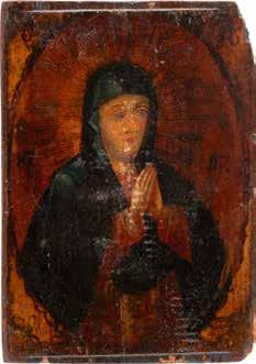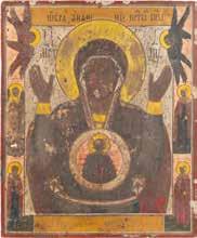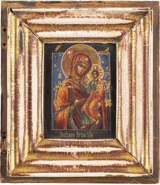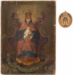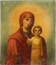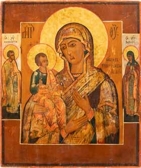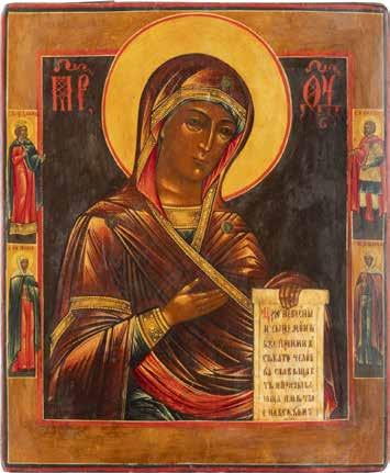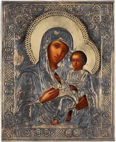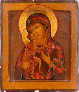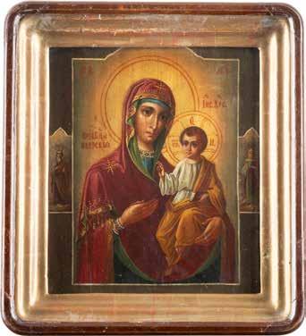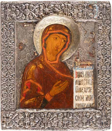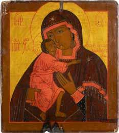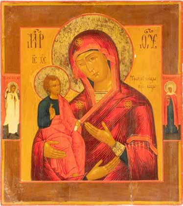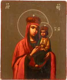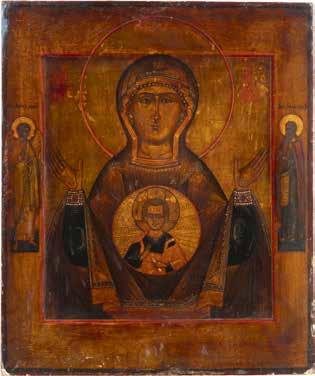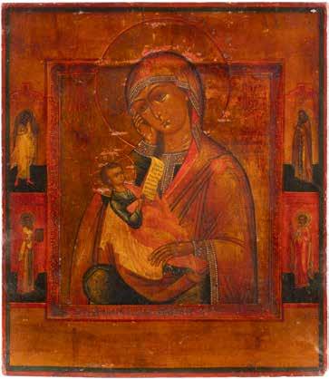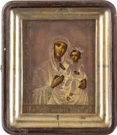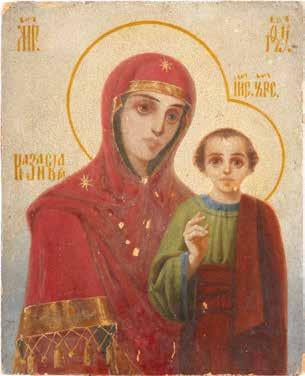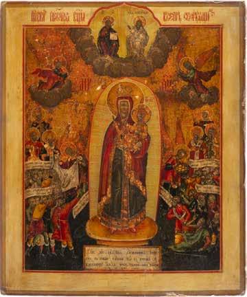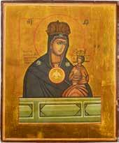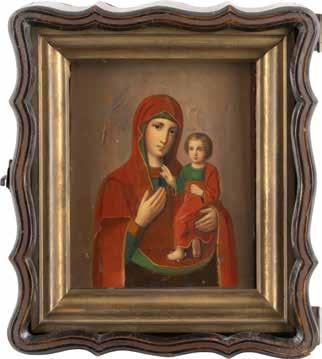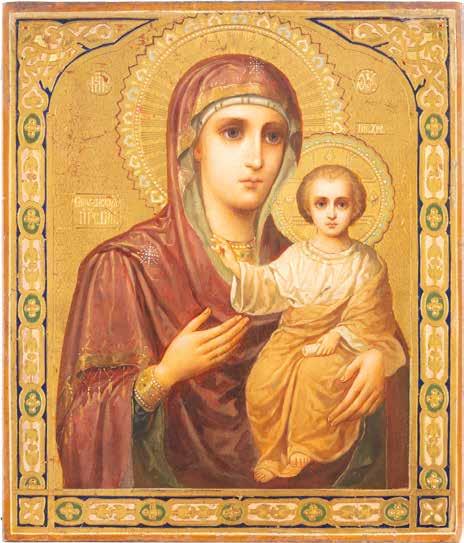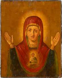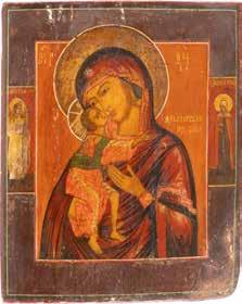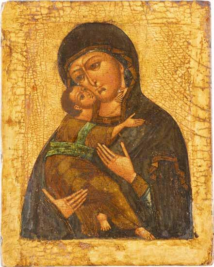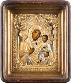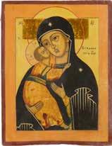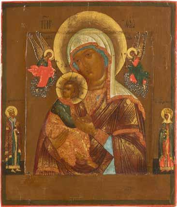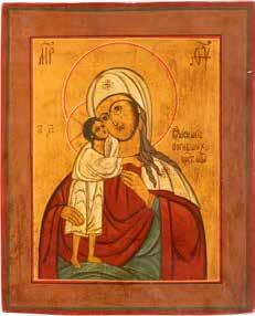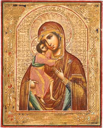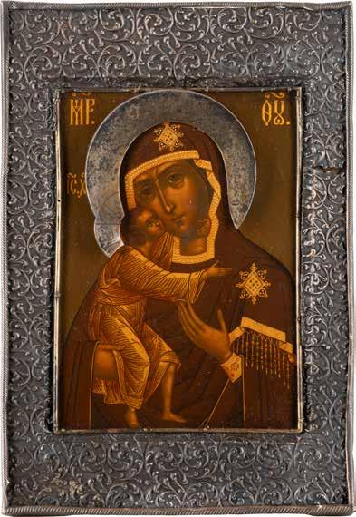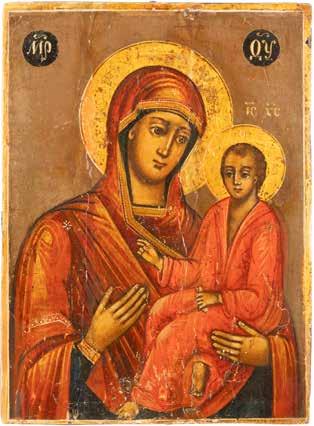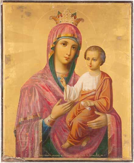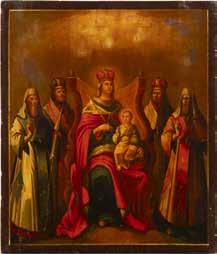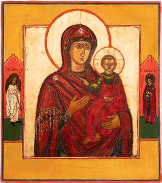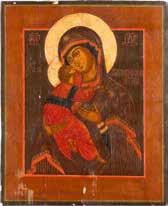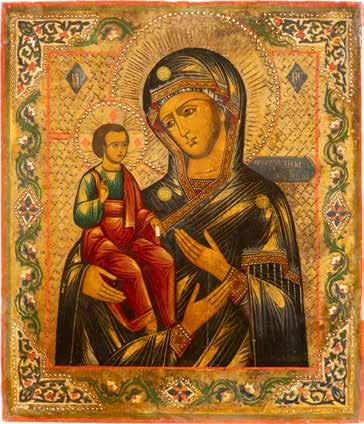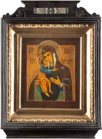A SMALL ICON SHOWING THE SMOLENSKAYA MOTHER OF GOD Russian, 19th century Tempera on wood panel. Traces of gilding. Partially repainted in recent decades. 22.5 x 17.7 cm (without frame).