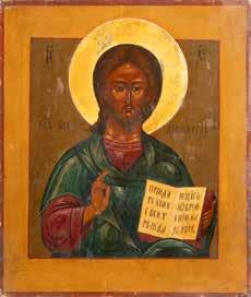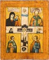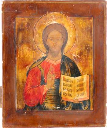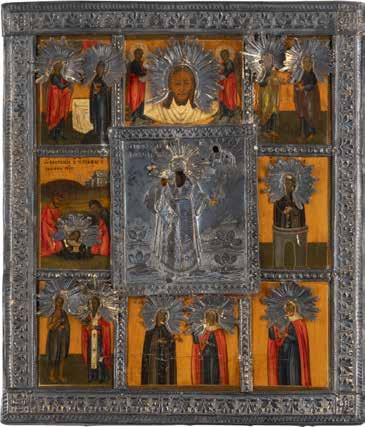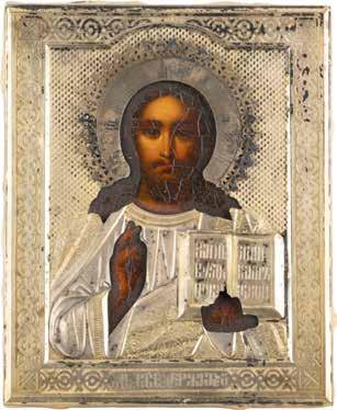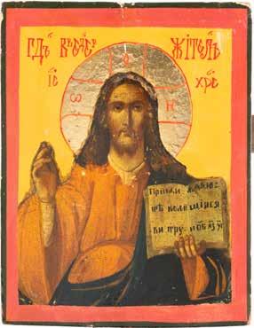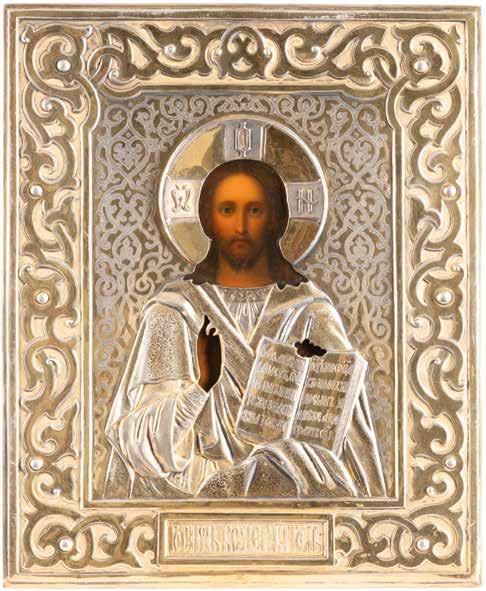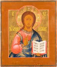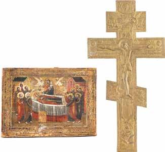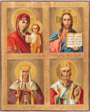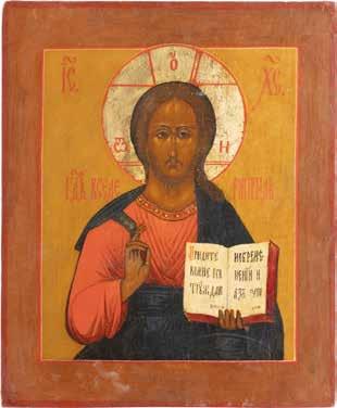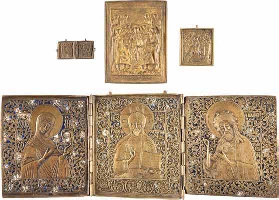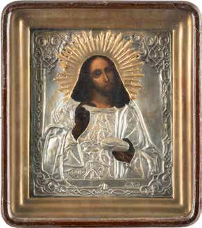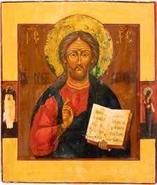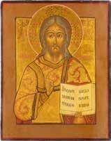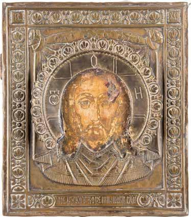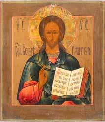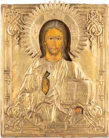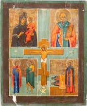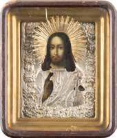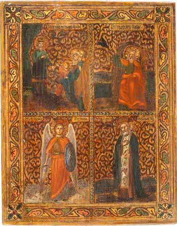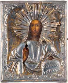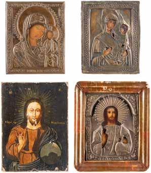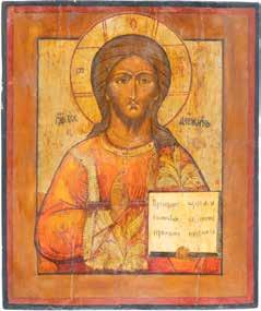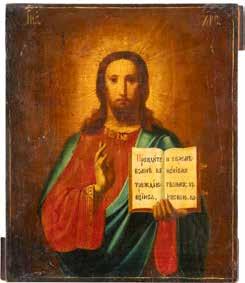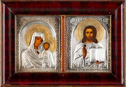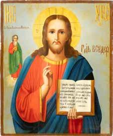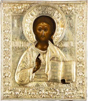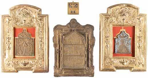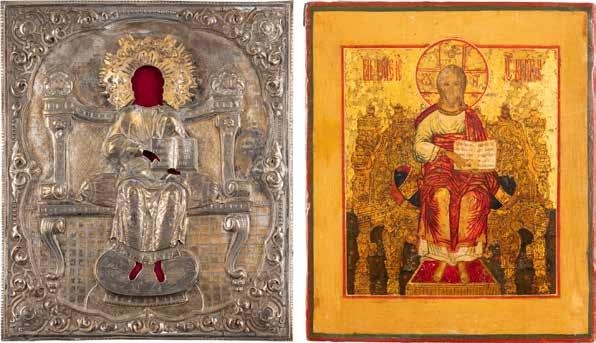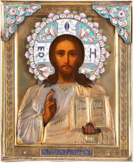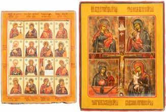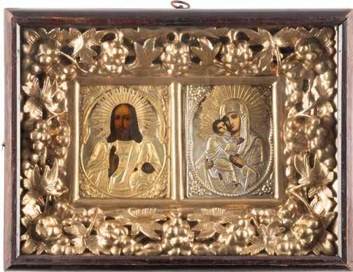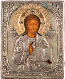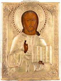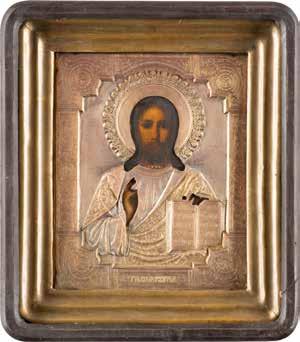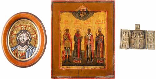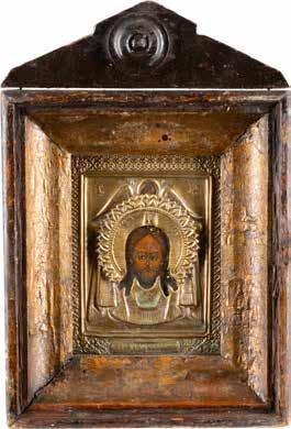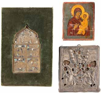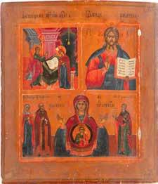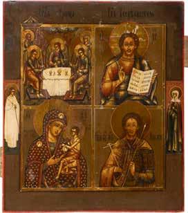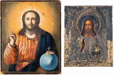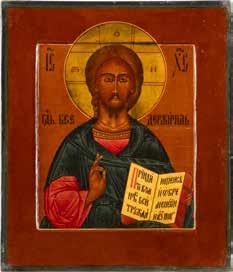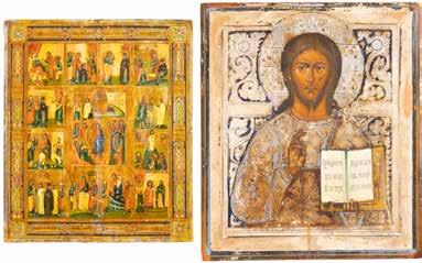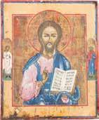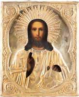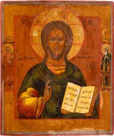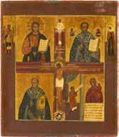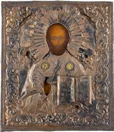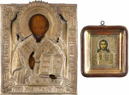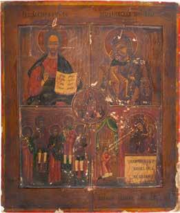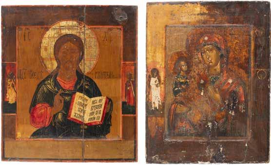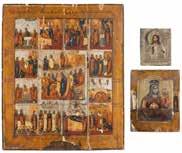 TWO SMALL ICONS: A QUADRI-PARTITE ICON AND CHRIST PANTOKRATOR WITH OKLAD Russian, 19th century Tempera oil on wood panels. Overlaid with a brass oklad. Partially restored. 25 x 18 cm / 22.2 x 17.9 cm. € 120,-