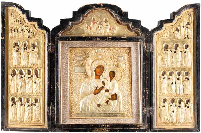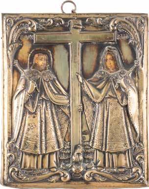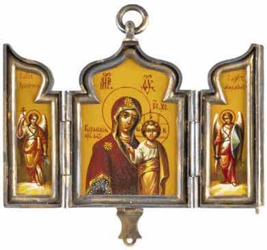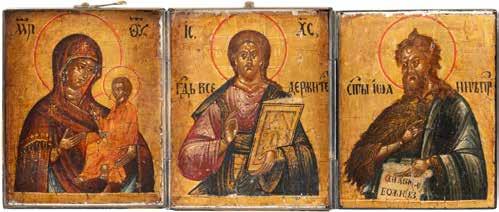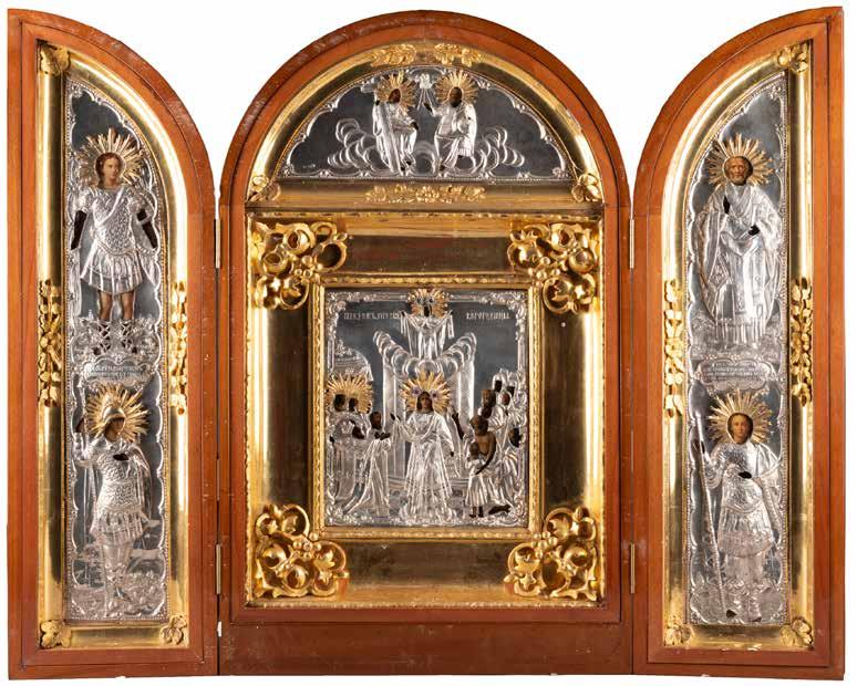 Tempera on wood panels with kovcheg. Overlaid with a silver oklad. Marked with assayer‘s mark and 84 standard. Partially restored. 12.8-18.3 cm high.