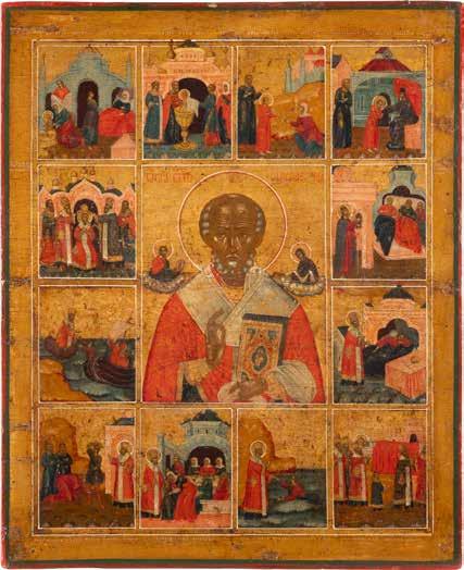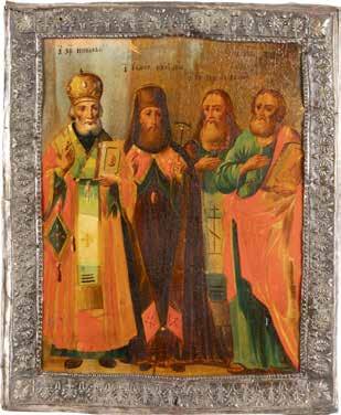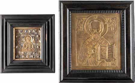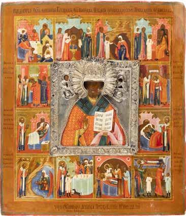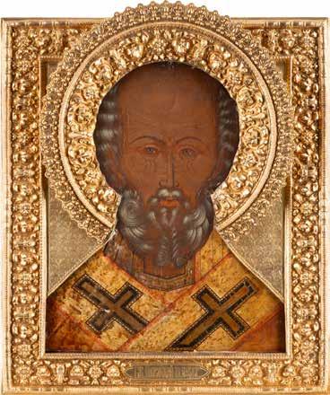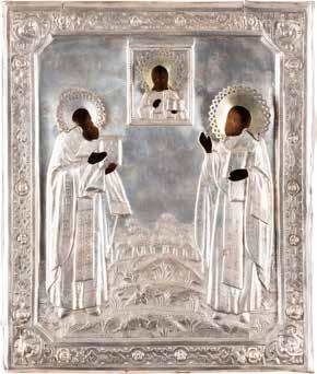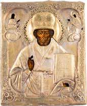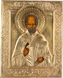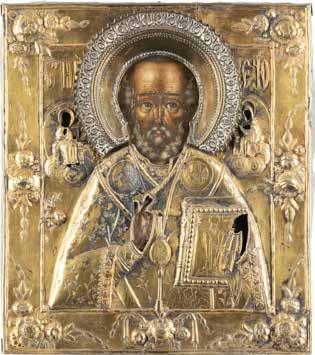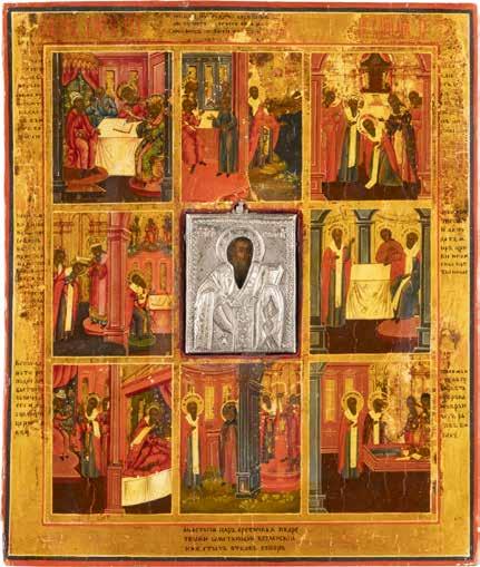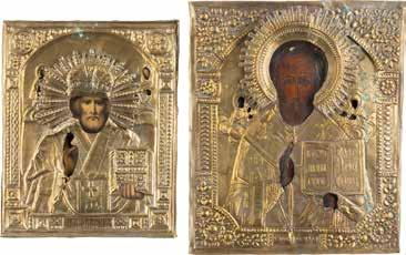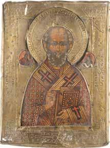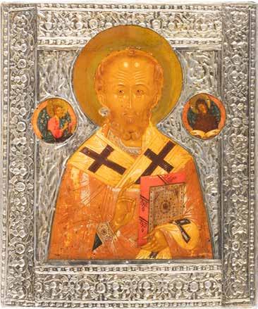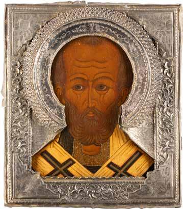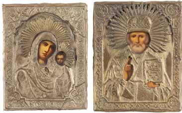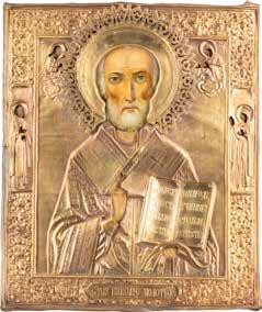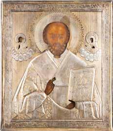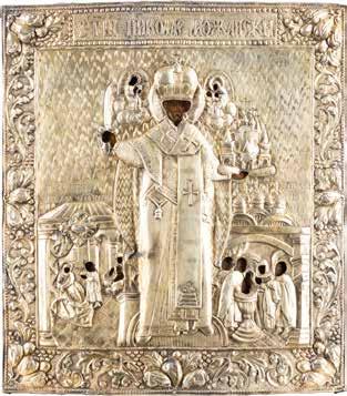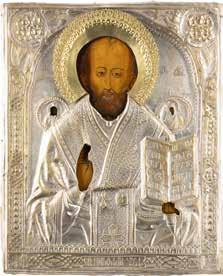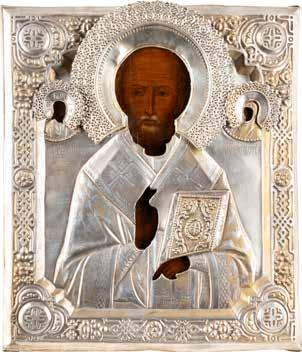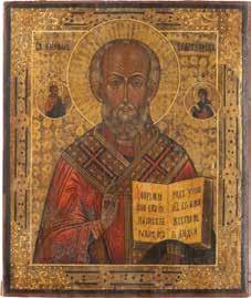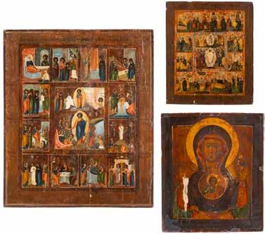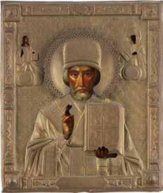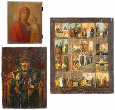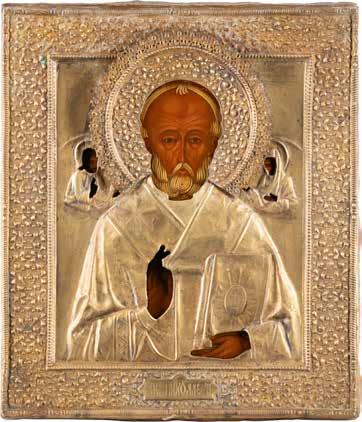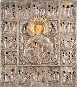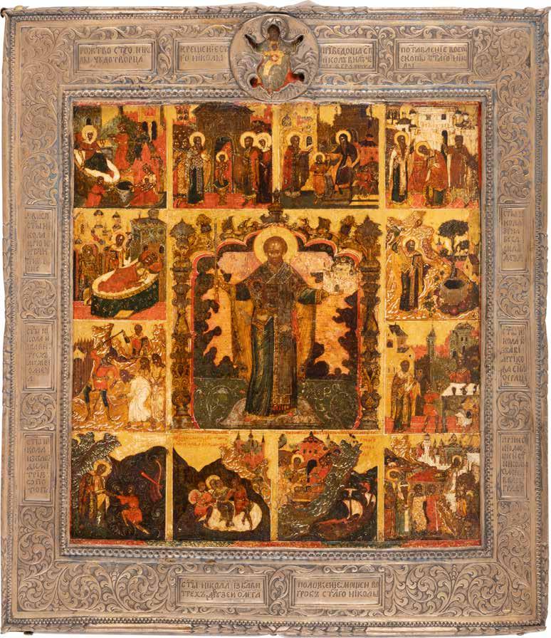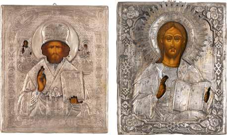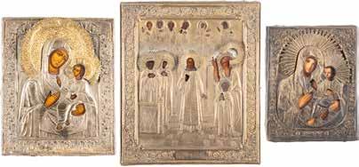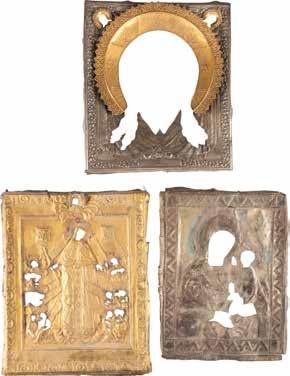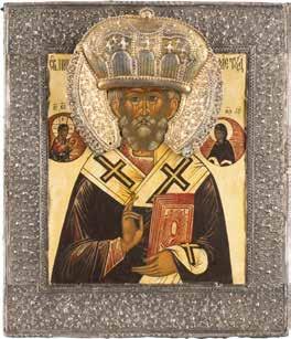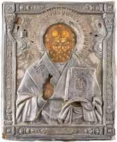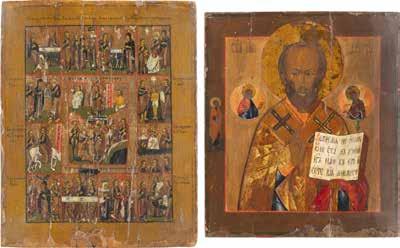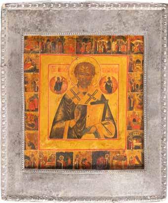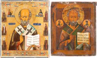 TWO ICONS SHOWING ST. NICHOLAS OF MYRA AND A FEAST DAY ICON Russian, 2nd half 19th century Tempera on wood panels. The background made of silver, covered by a golden lacquer. Losses. 30.5 x 26.2 cm / 30.6 x 26 cm.