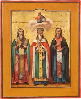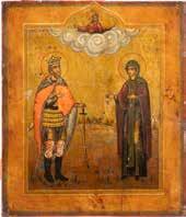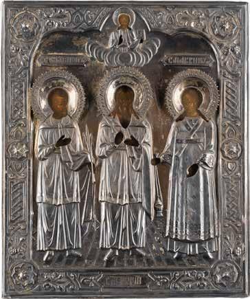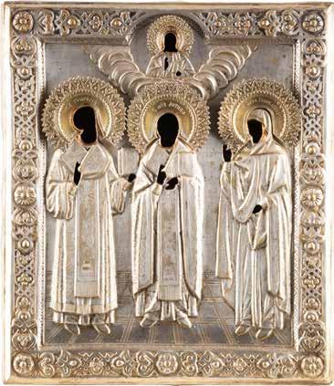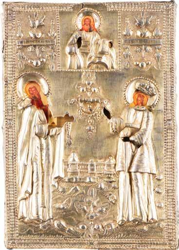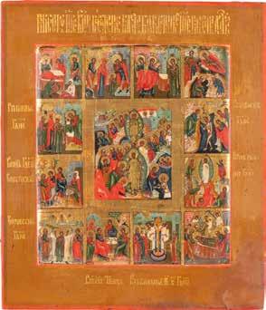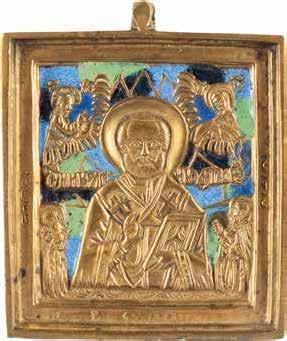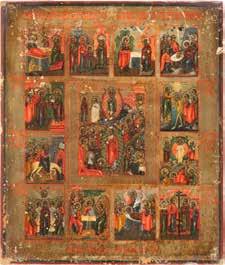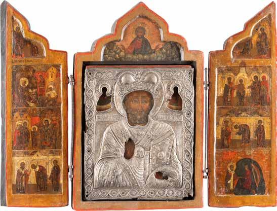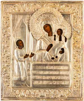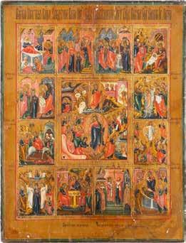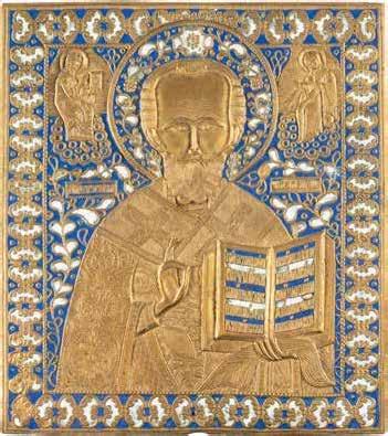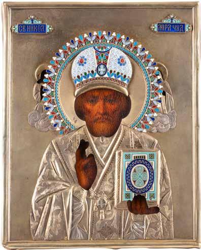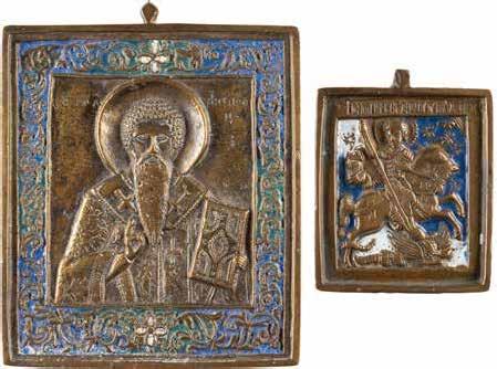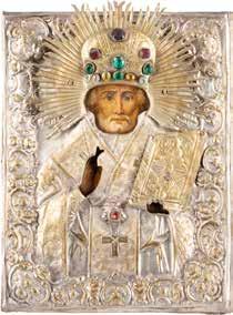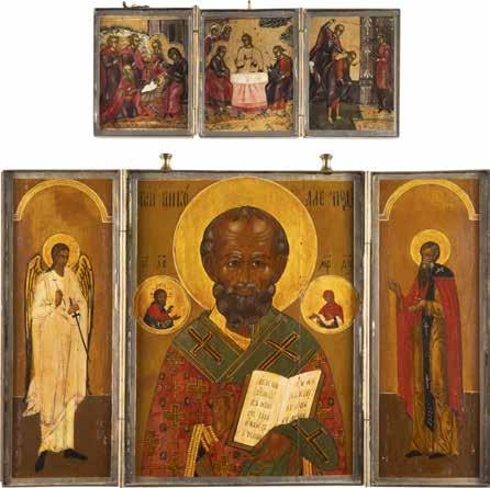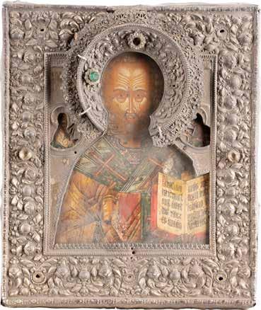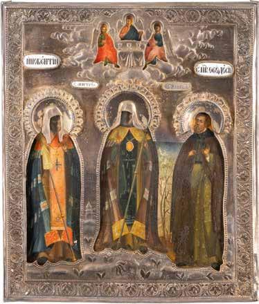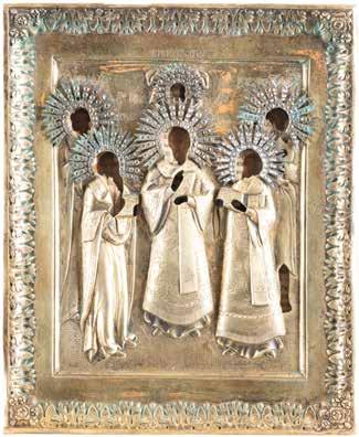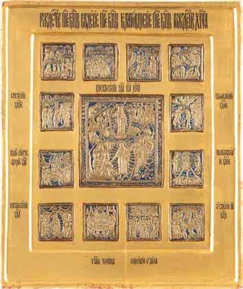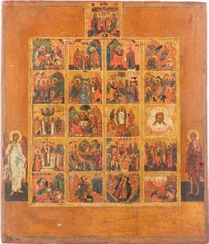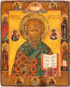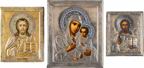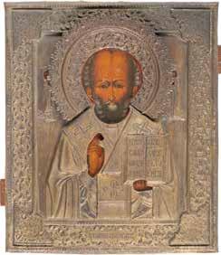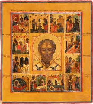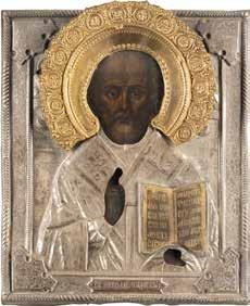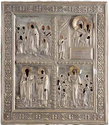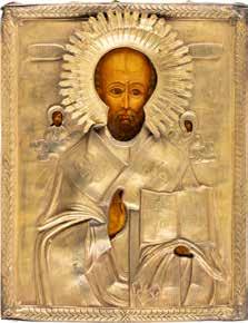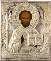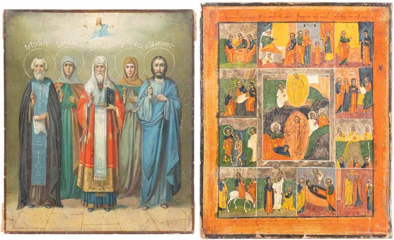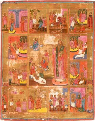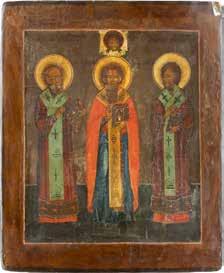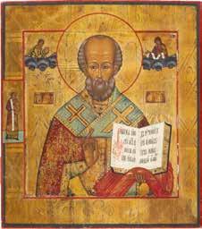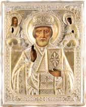 TWO ICONS SHOWING ST. NICHOLAS OF MYRA AND A FEAST DAY ICON Russian, 2nd half 19th century Tempera on wood panels. The background made of silver, covered by a golden lacquer. Losses. 30.5 x 26.2 cm / 30.6 x 26 cm.