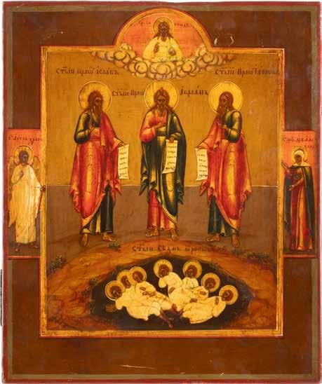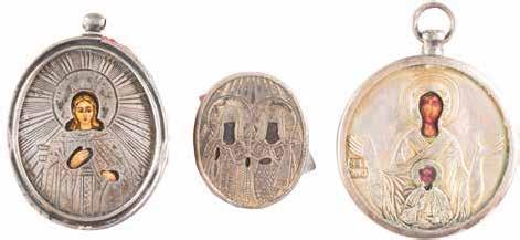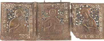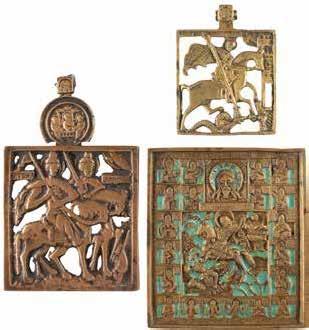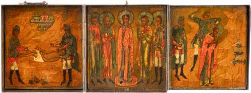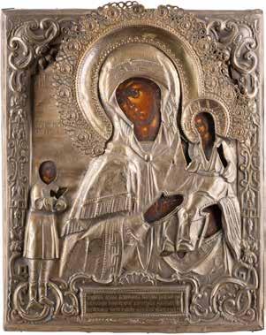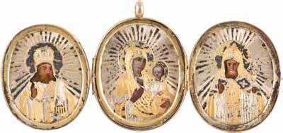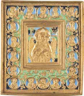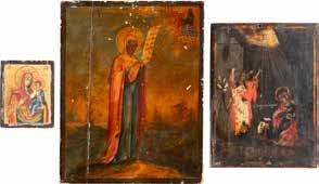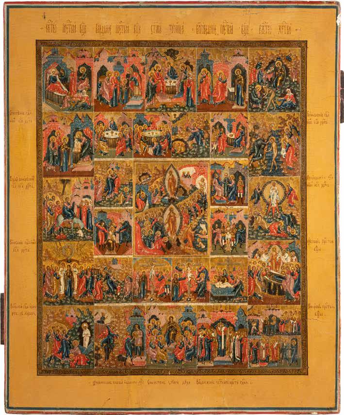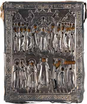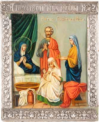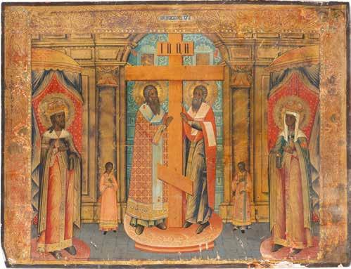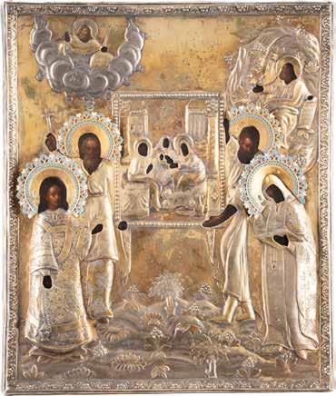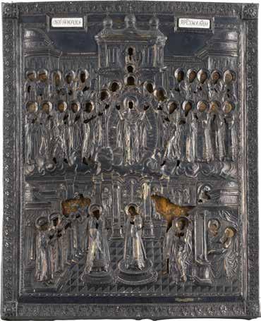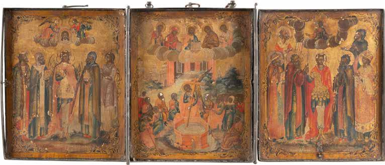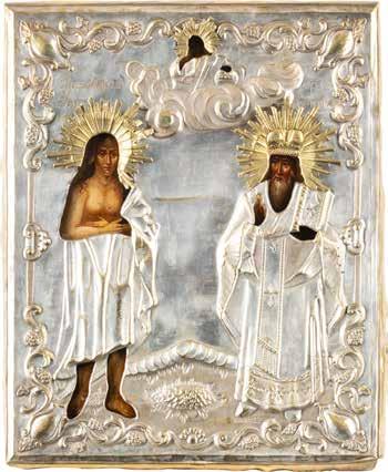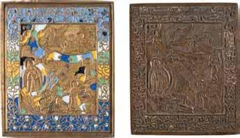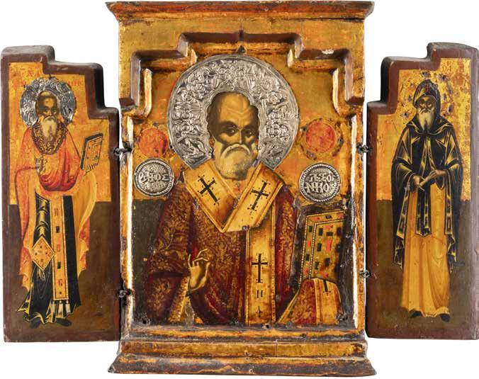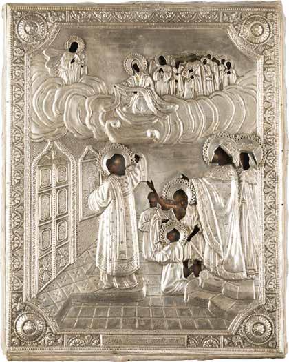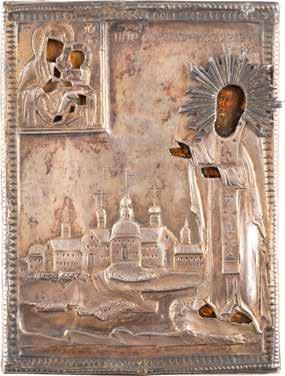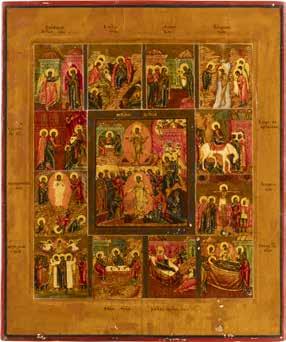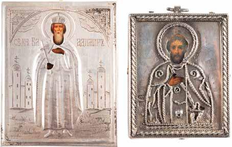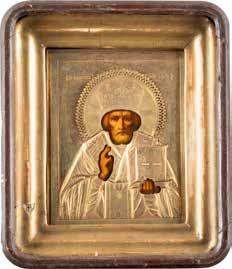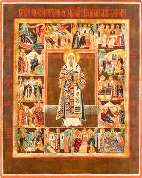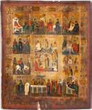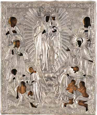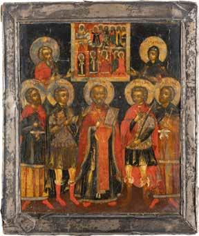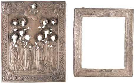 TWO ICONS SHOWING ST. NICHOLAS OF MYRA AND A FEAST DAY ICON Russian, 2nd half 19th century Tempera on wood panels. The background made of silver, covered by a golden lacquer. Losses. 30.5 x 26.2 cm / 30.6 x 26 cm.