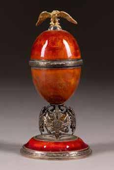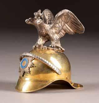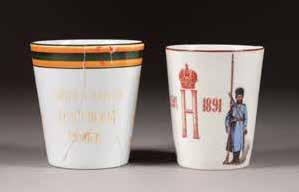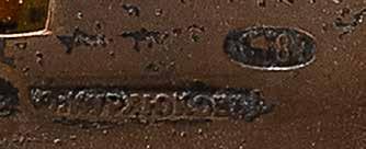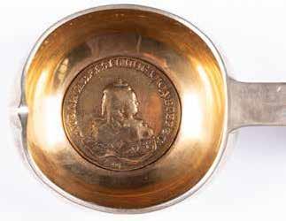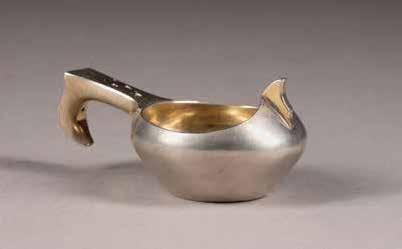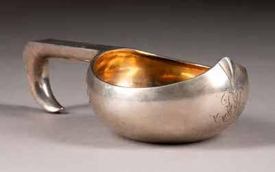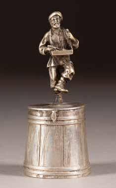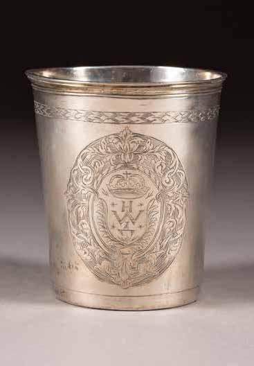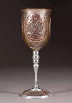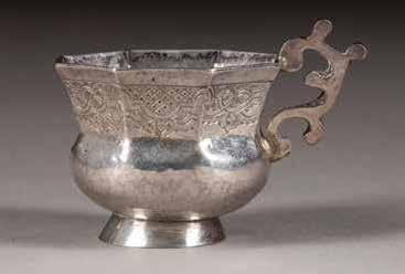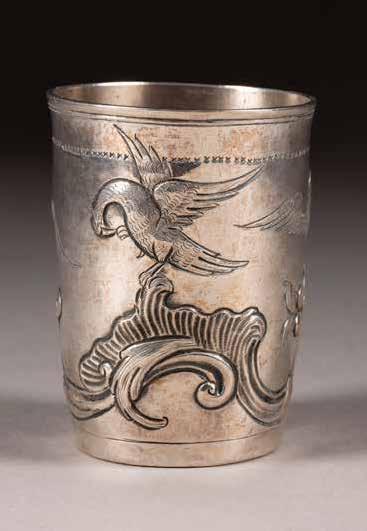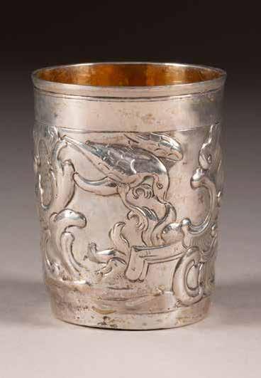 Silber, getrieben und ziseliert. H. 5 cm, 52 g. Auf der Bodenunterseite punziert mit Stadtmarke, Beschaumeisterzeichen, Aldermannsmarke und Meistermarke 'STh' in Kyrillisch.