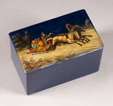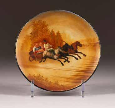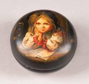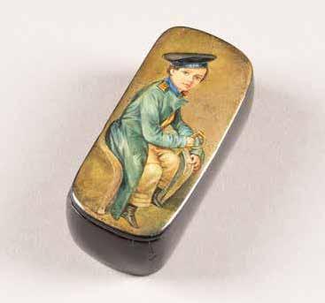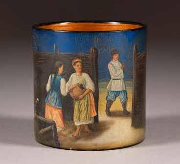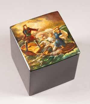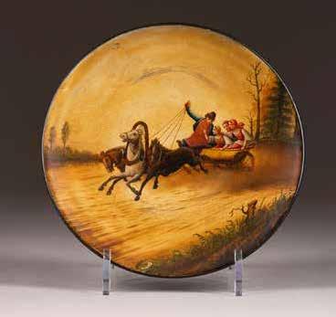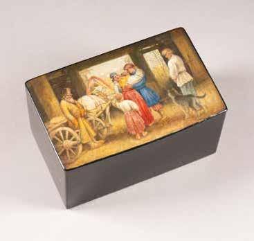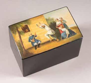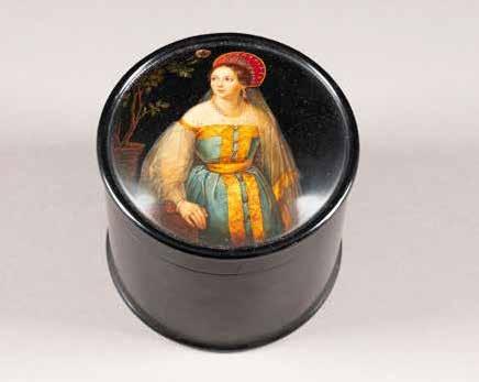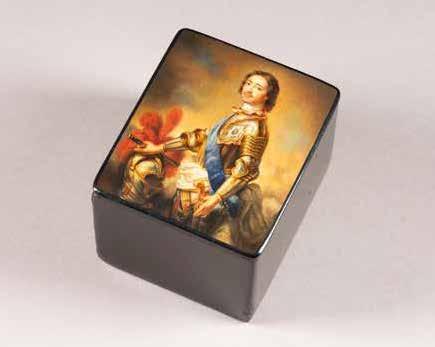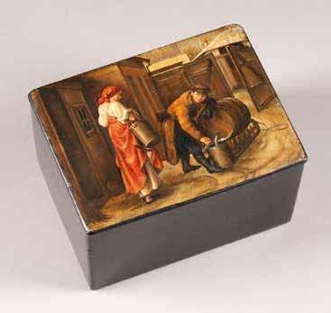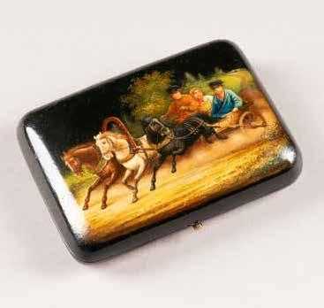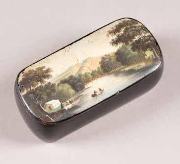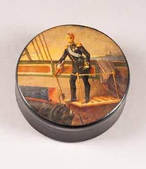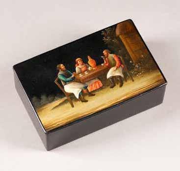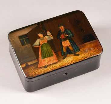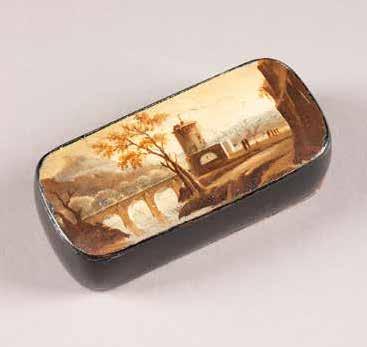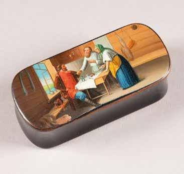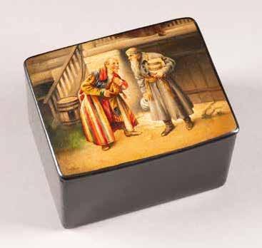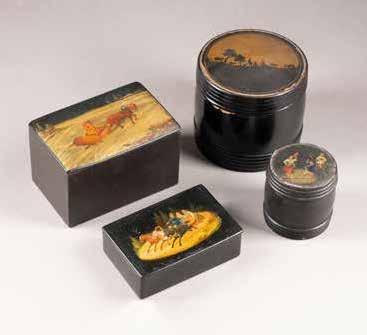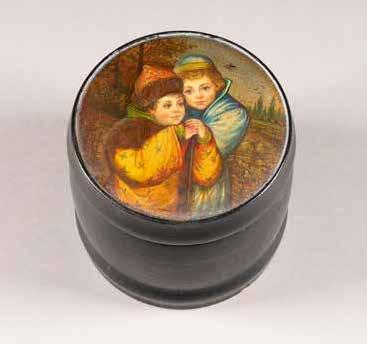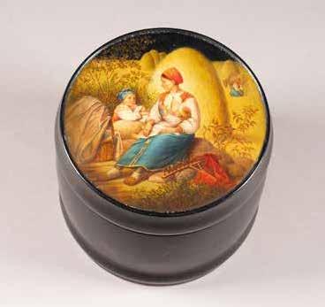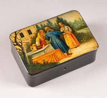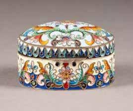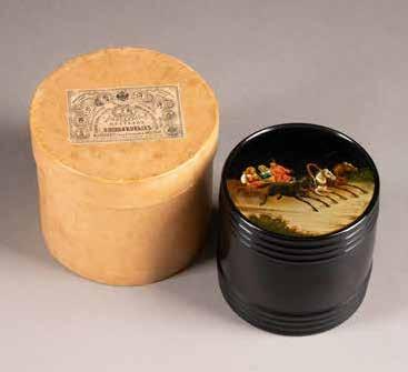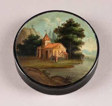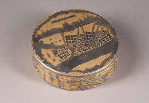 Russian, Tobolsk, late 18th century Circular, the cover depicting a plan of the city of Tobolsk, with views of architectural landmarks and the Irtysh River, on a stippled ground, within a rocaille border, the base similarly decorated and depicting the city of Yeniseisk, the sides depicting the cities of Tiumen, Tomsk, Tara, and Turinsk. Unmarked. Diam. 10.8 cm, 258 gr. € 700,–