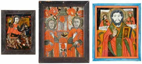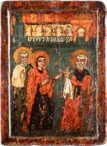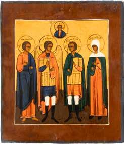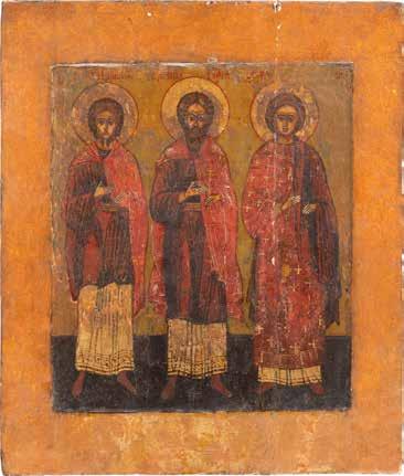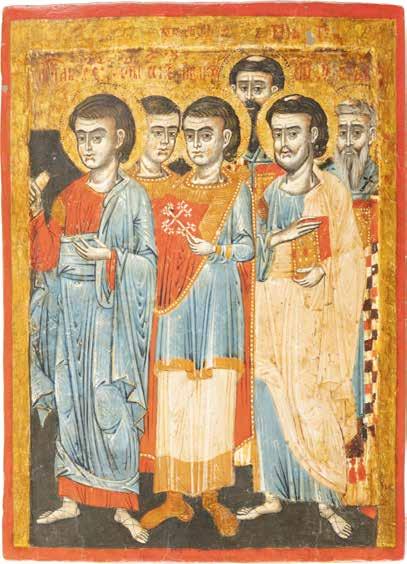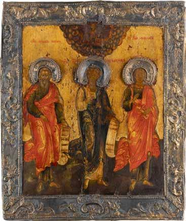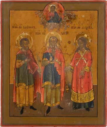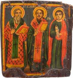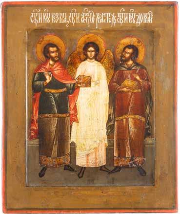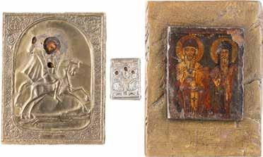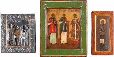 2892 | DREI KLEINE IKONEN: TAUFE CHRISTI MIT SILBER-OKLAD, DIE ARZTHEILIGEN KOSMAS, DAMIAN UND PANTELEIMON SOWIE