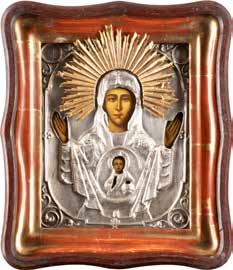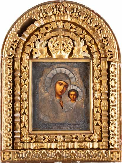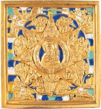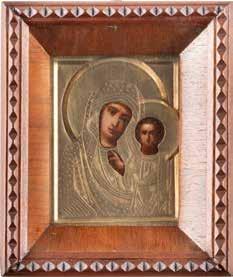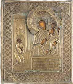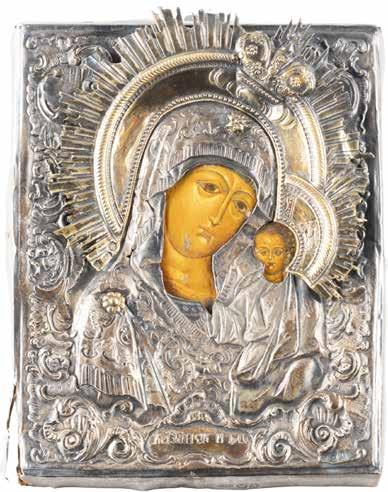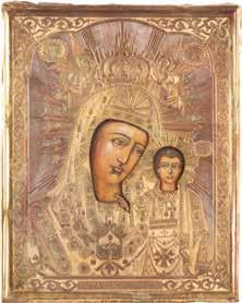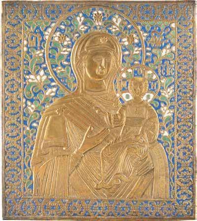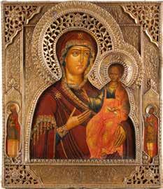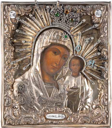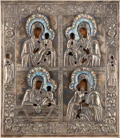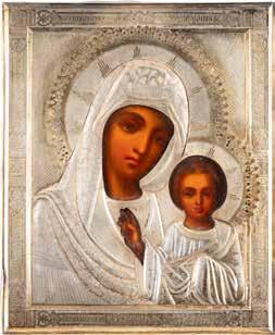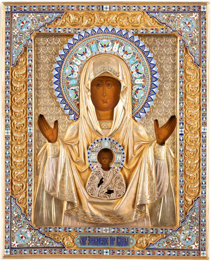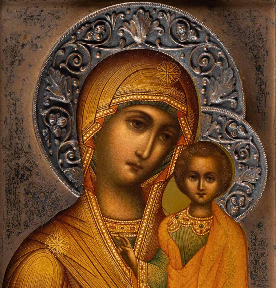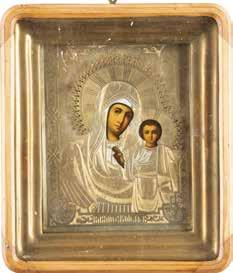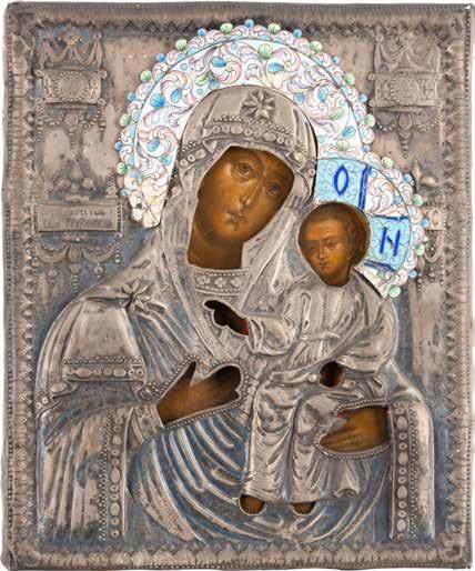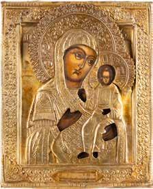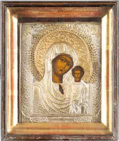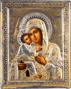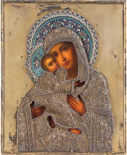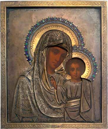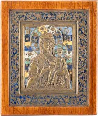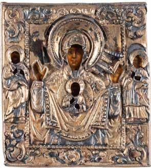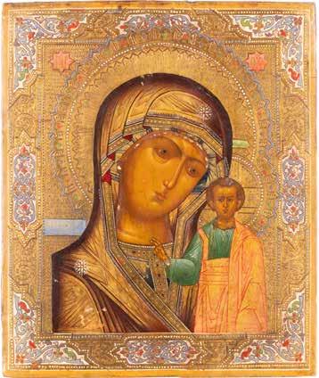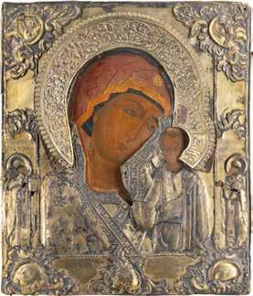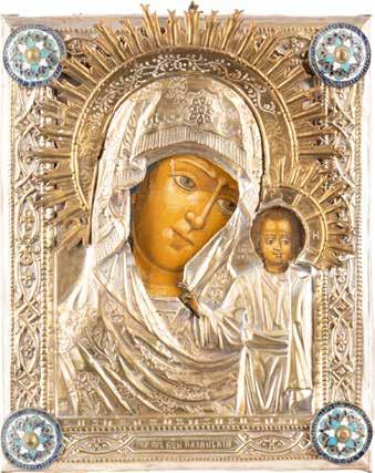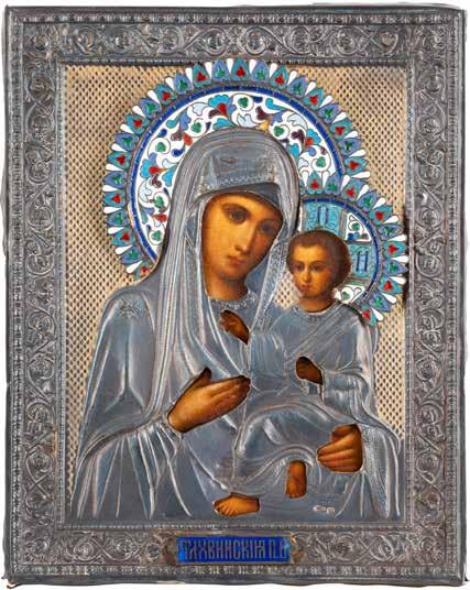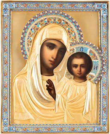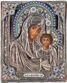 AN ICON SHOWING THE KAZANSKAYA MOTHER OF GOD WITH CLOISONNÉ-ENAMEL OKLAD