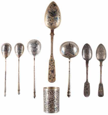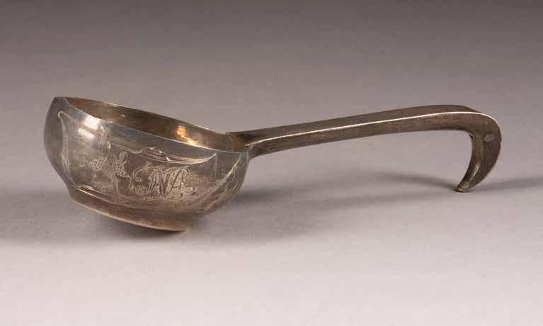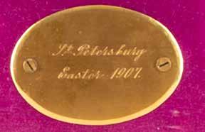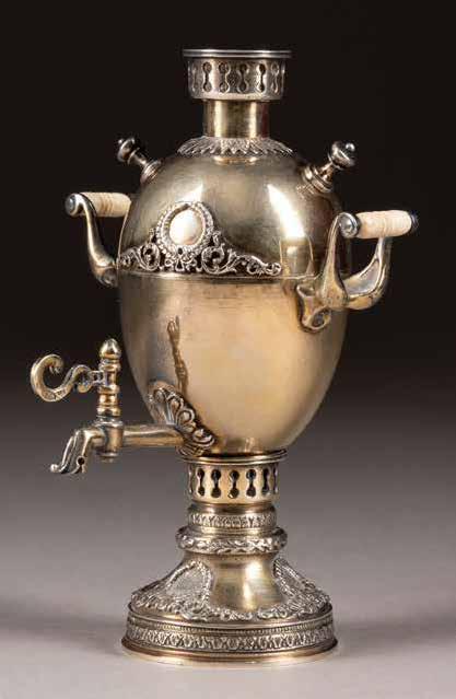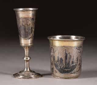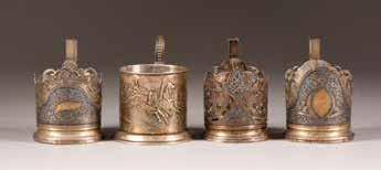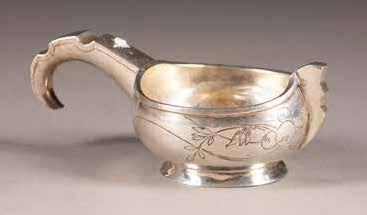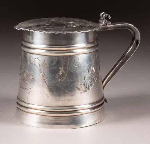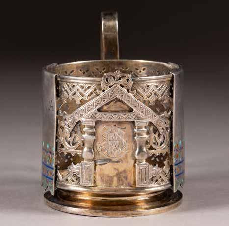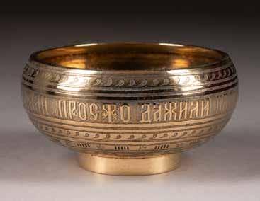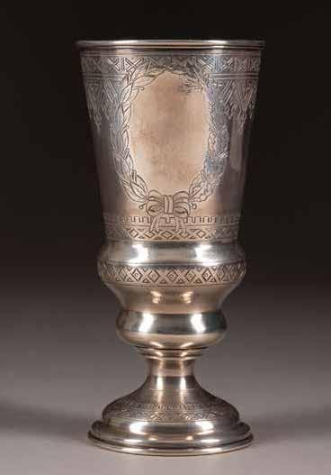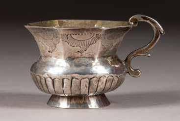 Silber, getrieben und graviert. H. 4,2 cm, 31 g. Punziert mit Stadtmarke, Beschaumeisterzeichen und Meistermarke 'MG' in Kyrillisch.