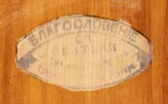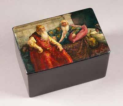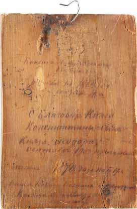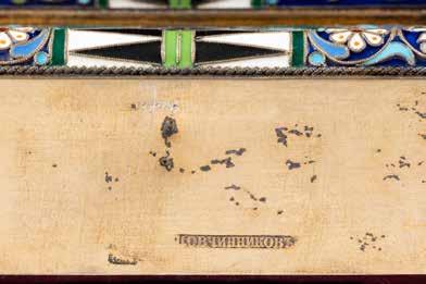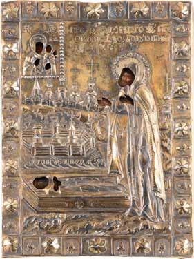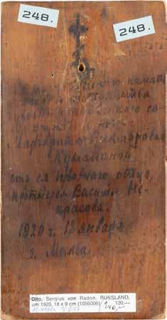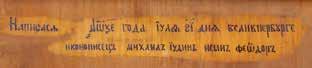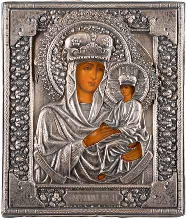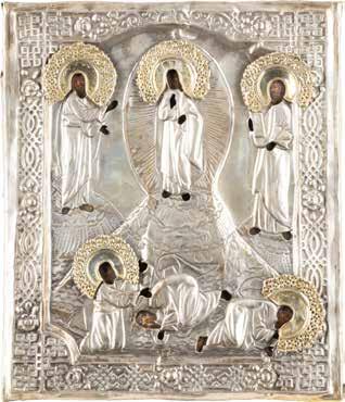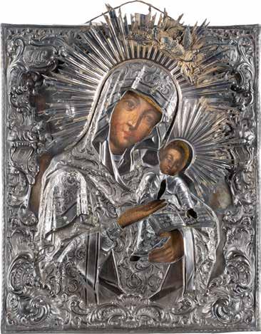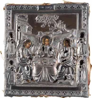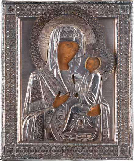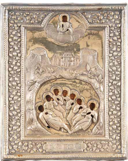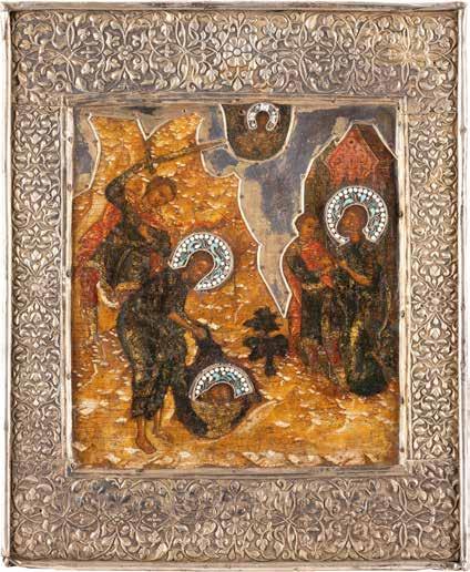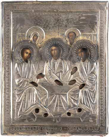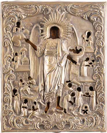 Eitempera auf Kreidegrund auf Holz, Kowtscheg, Silberoklad. H. 12,818,3 cm. Oklad punziert mit Feingehalt ‚84‘ und Beschaumarke. Partiell rest.