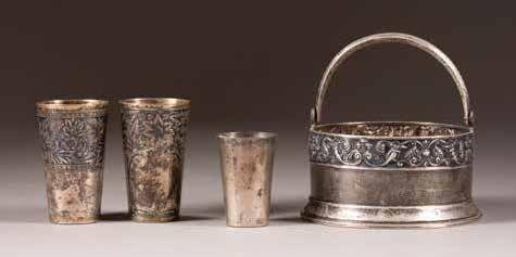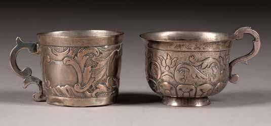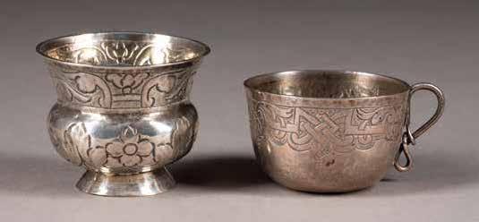 Russland, Moskau, 1765 / um 1790 Silber, getrieben und ziseliert. H. 2,8 / 3,5 cm, 40 g. Ein Tscharka punziert mit Stadtmarke, Beschauzeichen und Meistermarke 'WA' in Kyrillisch. Min. besch.