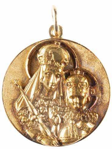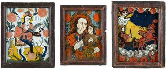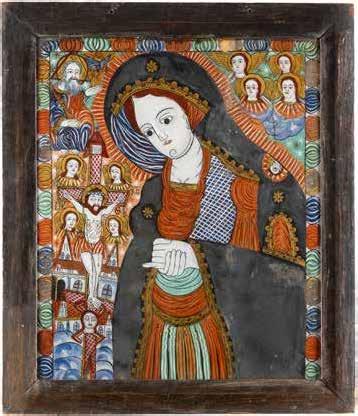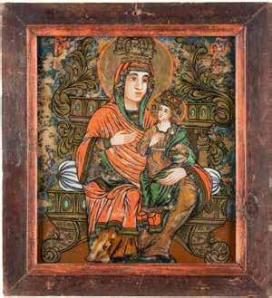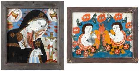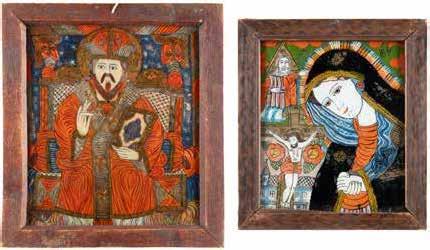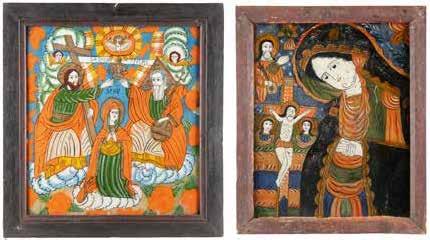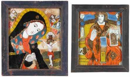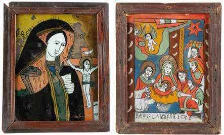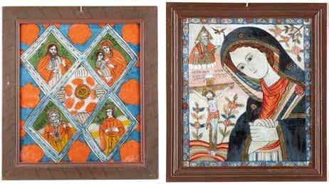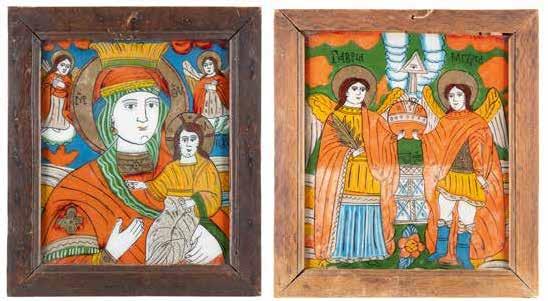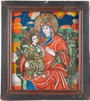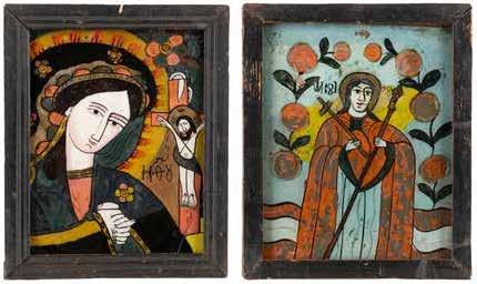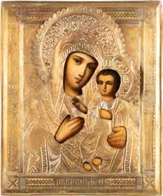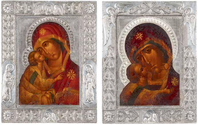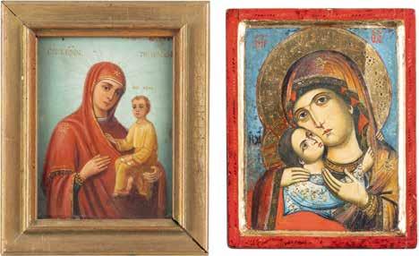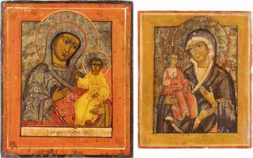 TWO LARGE ICONS SHOWING IMAGES OF THE MOTHER OF GOD WITH RIZA 2nd half 20th century Oil on canvas laid down on wood panels. Overlaid with a metal riza. On the reverse inscribed and signed ‚Hanna Kostecka‘. 44 x 34.2 cm.