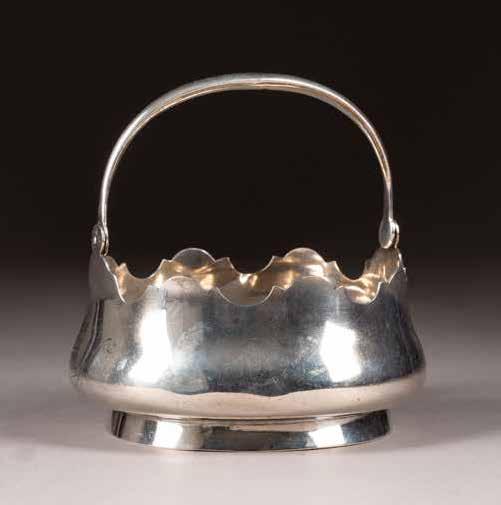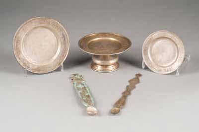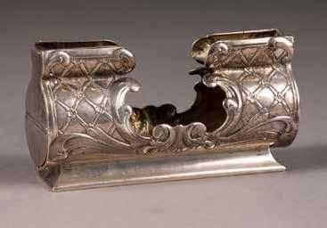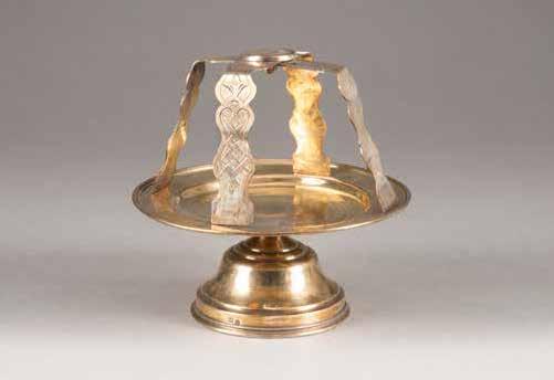 Silber, getrieben und ziseliert. H. 3,2 / 3,6 cm, 52 g. Min. gedellt.