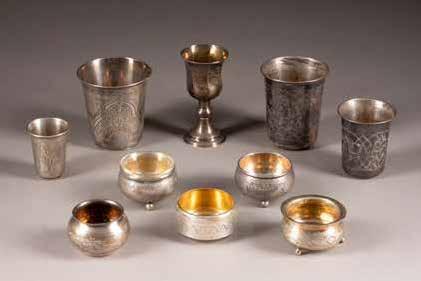 One charka marked under base with city hallmark, assayer's mark and master's mark 'VA' in Cyrillic. Minimally damaged. 2.8/3.5 cm high, 40 gr.