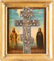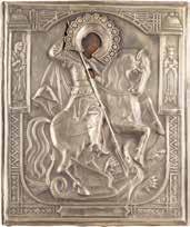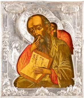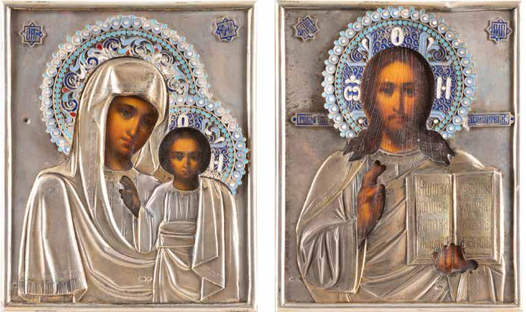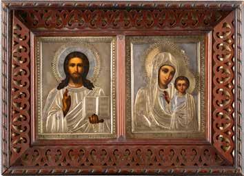 Russian, late 19th century Tempera on wood panels. The background made of silver, covered by a golden lacquer. The border decorated with engraved stylized patterns emulating the metal oklads of contemporary icons. Restorations. 26.3 x 21.2 cm / 26.8 x 22.7 cm.
