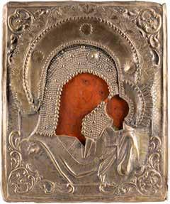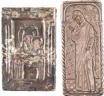 TWO SMALL ICONS SHOWING THE MOTHER OF GOD Eastern Europe, 19th/20th century Carved in relied, overlaid with metal oklads. 9.3 x 6.2 cm / 10.6 x 4.7 cm.
