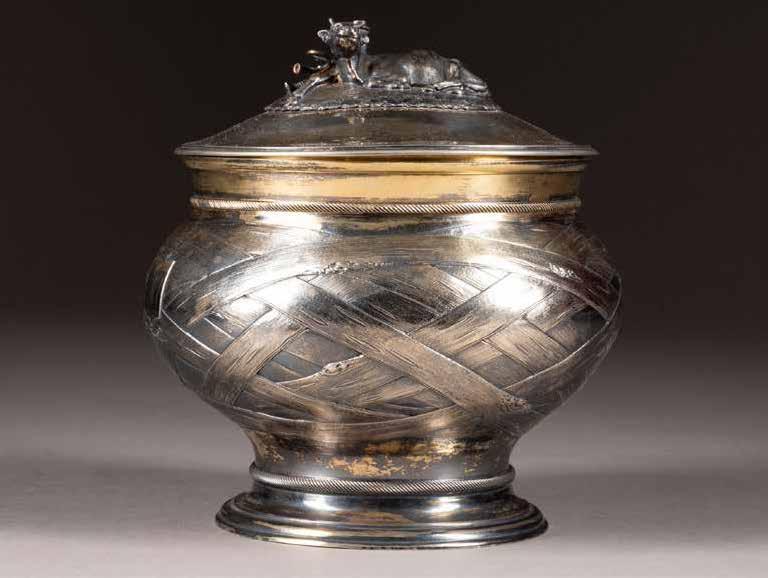 Russland, Tobolsk, Ende 18. Jh. Silber, vergoldet, teils punziert, Niello. D. 10,8 cm, 258 g. Der Deckel zeigt einen Plan der Stadt Tobolsk mit Ansichten architektonischer Sehenswürdigkeiten und des Flusses Irtysch innerhalb einer Rocaille-Bordüre, der Boden ist ähnlich dekoriert und zeigt die Stadt Jenisseisk. Die Wandung zeigt die Städte Tiumen, Tomsk, Tara und Turinsk.