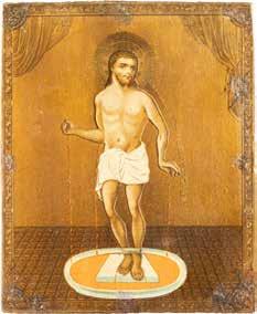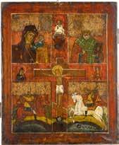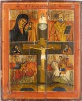 2900 IKONE MIT DER DARSTELLUNG DES PELIKANS VOR DEM KREUZ Ukraine, 19./20. Jh. Ölmalerei auf Leinwand auf Holz mit zwei Rückseiten-Sponki. 39 x 31,2 cm.