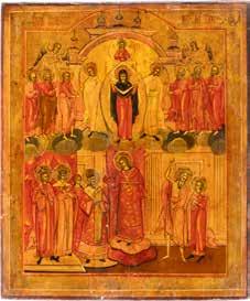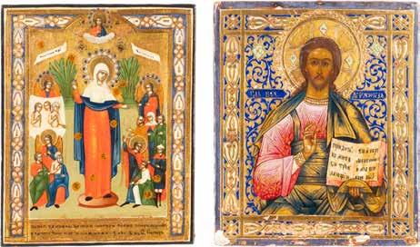 TWO ICONS SHOWING THE POKROV AND ST. NICHOLAS OF MYRA Russian, 19th century Tempera / oil on wood panels. Damages, losses. 26.5 x 21.3 cm / 34.3 x 31.3 cm.