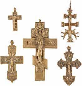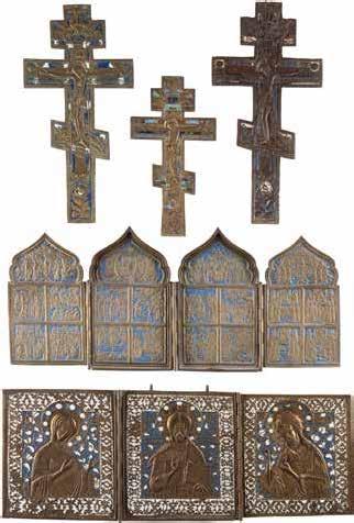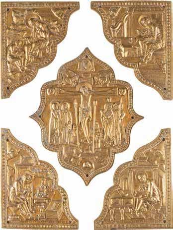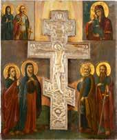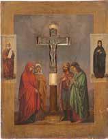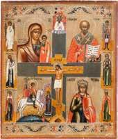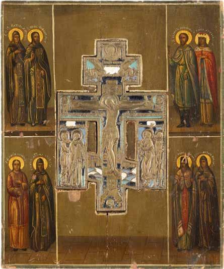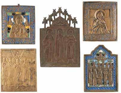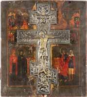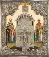 FIVE OKLADS OF ICONS SHOWING THE CRUCIFIXION, THE MOTHER OF GOD AND SELECTED SAINTS