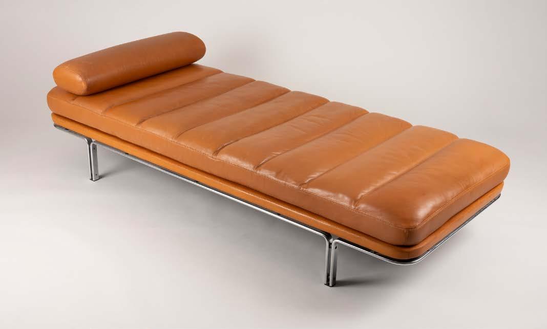 Bandstahl verchromt, Polsterauflage m. Nackenrolle, cognacfarbenes Leder. H.
