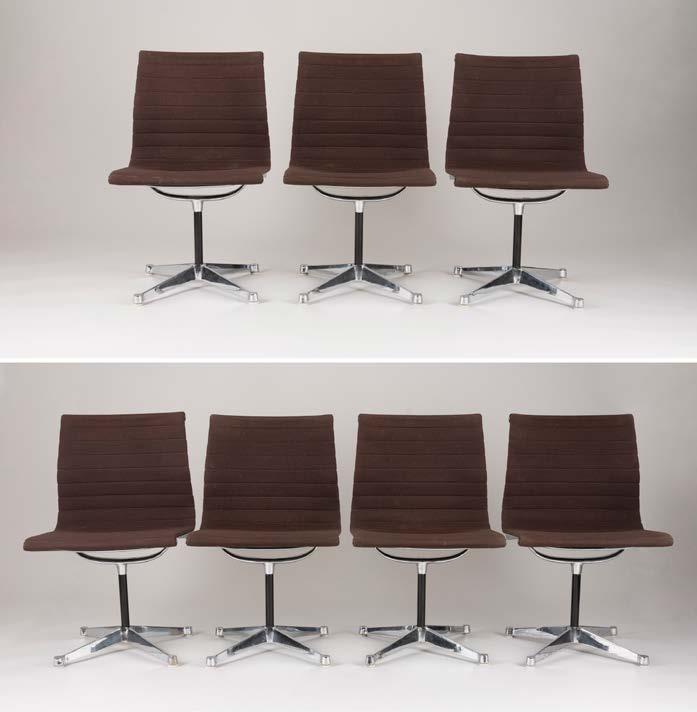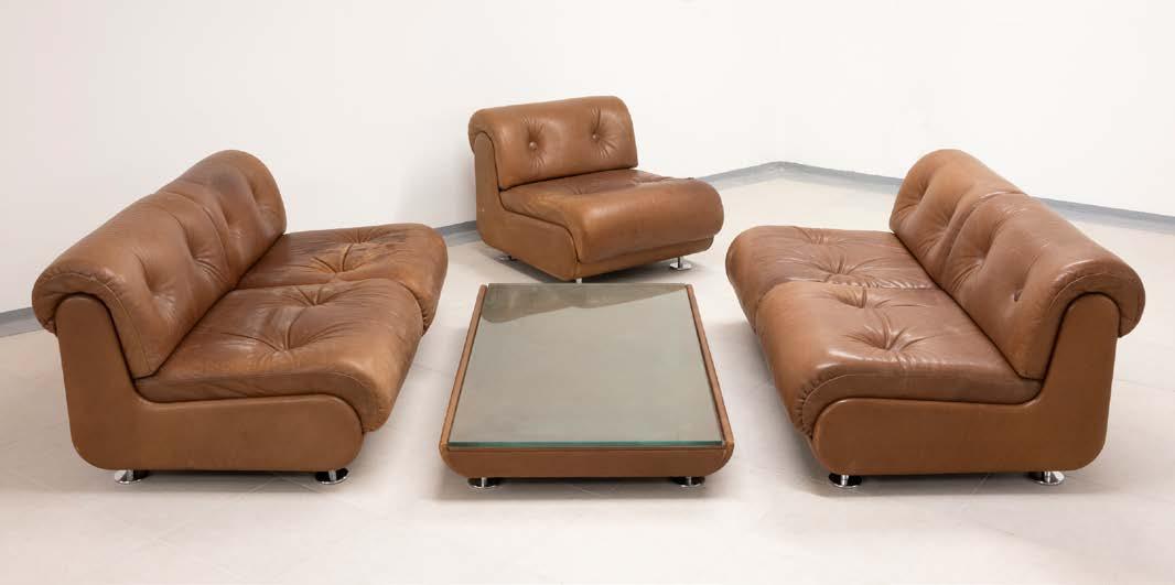 s chwere gepolsterte Rahmenkonstruktion, Lederbezüge braun, Glasplatte, Tellerfüße aus verchromtem Metall. H. 69 cm, B. 75 cm, T. 94 cm (sessel). Die Gruppe besteht aus zwei zweisitzigen sofas, einem sessel und passendem Couchtisch mit Glasplatte. Deutliche Gebrauchsspuren, Leder pat., teilw. besch., m. zahlreichen Flecken u. Kratzspuren.