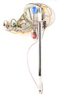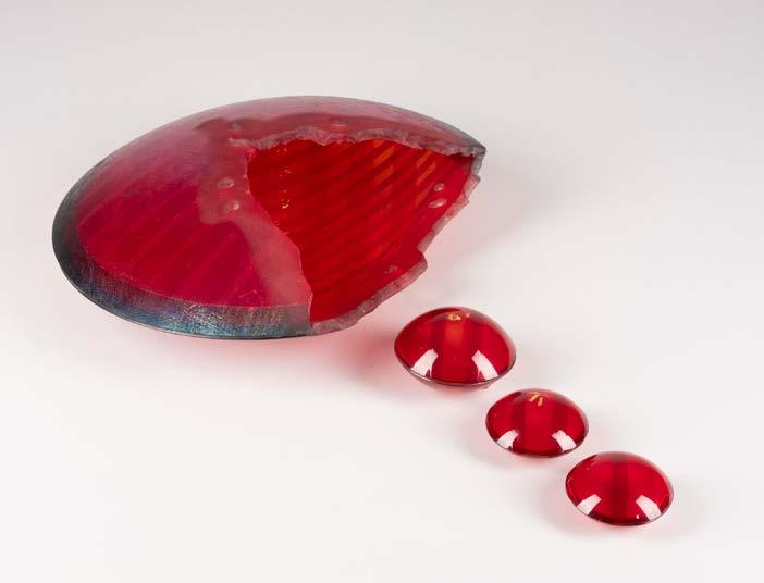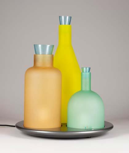 Metall lackiert, flaschenartige Diffusoren aus farbigem Glas, 3-flg. elektrifiziert. H. 49 cm, D. 40 cm. Mit Etikett bez. Leichte Gebrauchsspuren, Lackierung part. m. Kratzspuren.