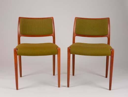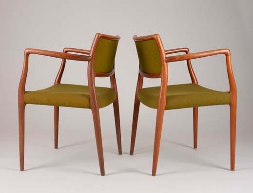 Massives Teakholz, originale Polster m. grünem ‚Hallingdal‘ stoffbezug. H. 79 cm, B. 57 cm, T. 51 cm. In der Zarge m. Brandstempel bez. Leichte Gebrauchsspuren, o berflächen part. m. Kratzspuren u. teilw. fleckig. Der von Niels o. Møller verwendete ‚Hallingdal‘ Polsterstoff wurde 1965 von Nanna Ditzel für Kvadrat entworfen.