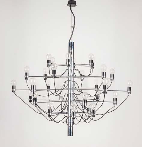 Verchromtes Aluminium, stahlblech lackiert, Kupferblech gebürstet, m. Lampenfassung E 40 - 300 W elektrifiziert. H. 60 cm, D. 60 cm, L. ca. 130 cm. Bez. Herstelleretikett. Die Leuchte wurde in den 1960er Jahren gefertigt. Leichte Gebrauchsspuren, etwas angeschmutzt, o berflächen teilw. m. Kratzspuren.