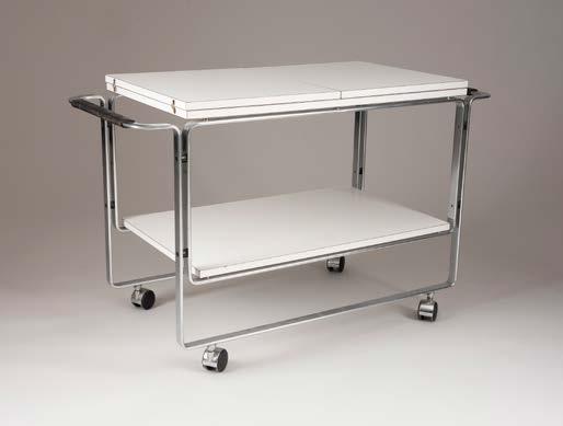 SERVIERWAGEN / TEEWAGEN MODELL ‚T 128‘ Deutschland, Kill International, Entwurf 1968 Bandstahl verchromt, Lederwicklung schwarz, teilw. klappbare, weiß laminierte Platten. H. 64 cm, B. 103 / 156 cm, T. 45 cm. Leichte Gebrauchsspuren, part. min. flugrostig.
