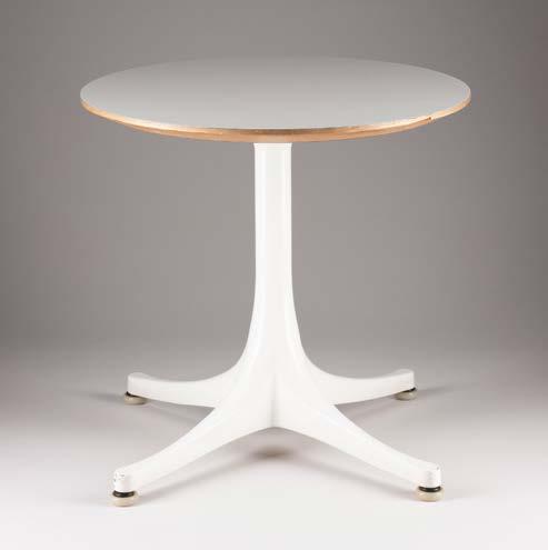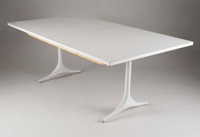Aluminiumguss weiß lackiert, Holz, überw. weiß laminiert. H. ca. 72 cm, B. 285/ 233/ 183, T. 102 cm. Unterseitig bez. ‚Herman Miller - Designer George Nelson‘ (Papieretikett). Die Tischfläche lässt sich durch einen schiebemechanismus und zwei separate Einlegeplatten vergrößern. Leichte Gebrauchsspuren.
