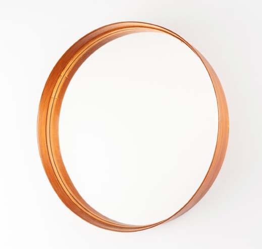 Teak-schichtholz, verspiegeltes Glas, Lederriemen. D. 30 cm. T. 4,5 cm. Rückseitig m. Papieretikett bez. Gebrauchsspuren, Leder part. ber., die Riemen zur Aufhängung fehlen.