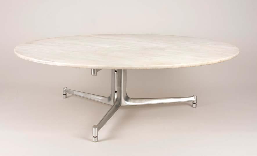 Untergestell aus Aluminiumguss, Platte aus Travertin. H. 49 cm, D. 150 cm. o berflächen teilw. m. Kratzspuren.