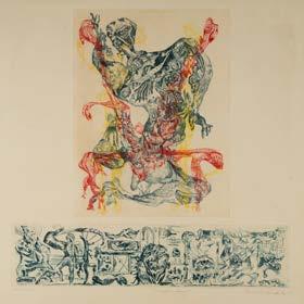 2 Lithografien. sM 22 x 21,5 cm (R. 41,5 x 36 x 2 cm) bzw. sM 29 x 22,5 cm (R. 51 x 40 x 2 cm). Teilw. unten rechts handsigniert. Jew. leicht gebräunt. Jew. im Passepartout und hinter Glas gerahmt (ungeöffnet).