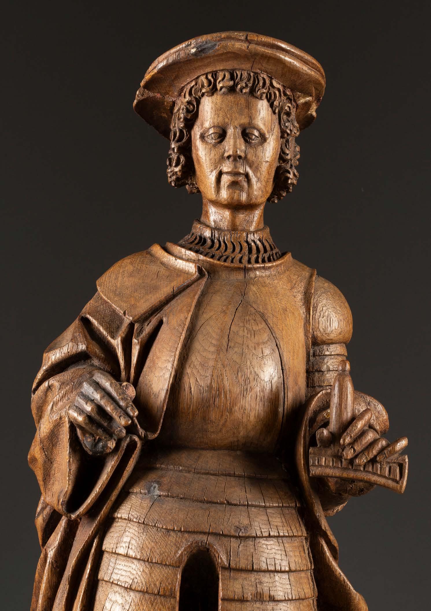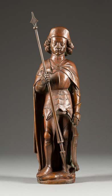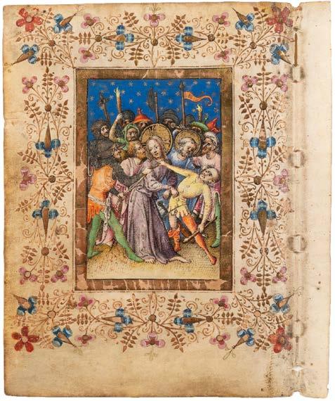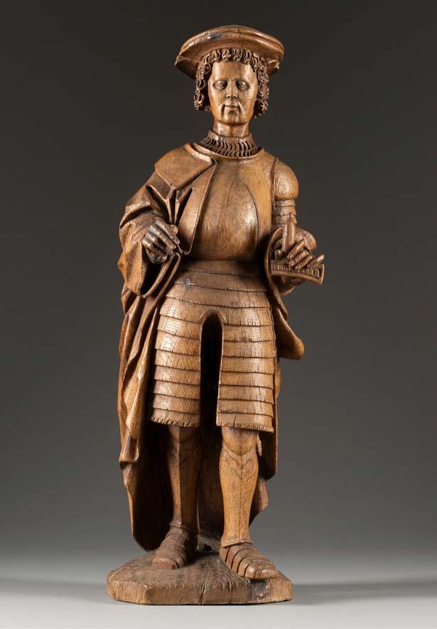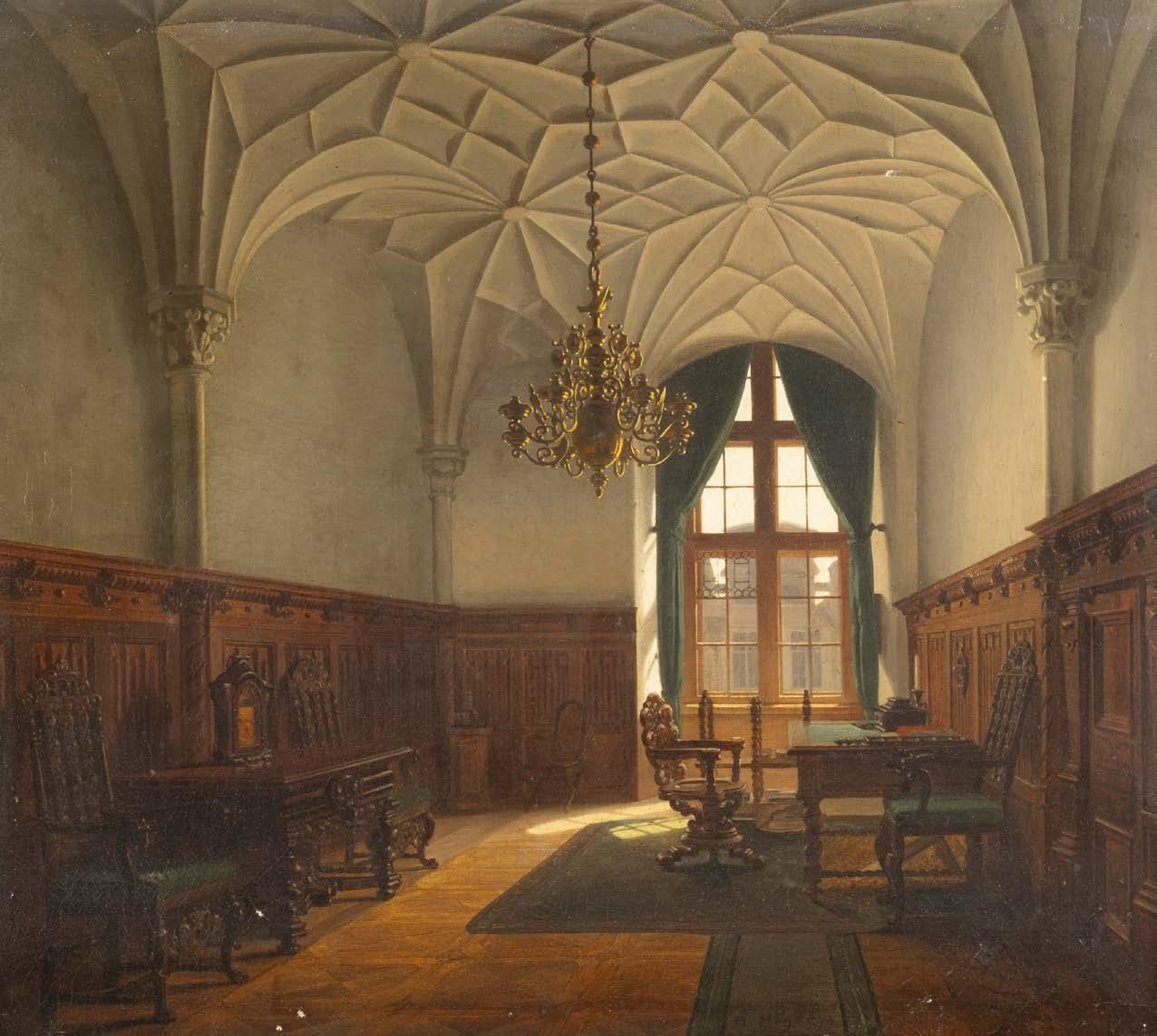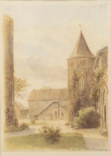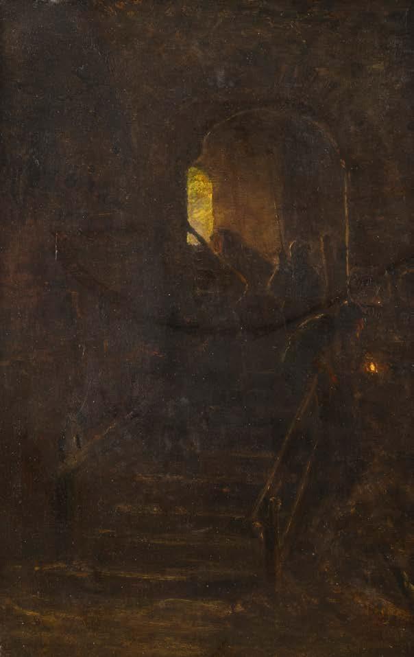 Öl auf Leinwand. 38,5 x 27 cm (R. 56,5 x 43 cm). Unten links signiert ‚C. Scheuren‘. Verso: Luchtenberg Sammlungsinventarnummer ‚B/r 70‘. an den Rändern tlw. restauriert und min. berieben. Rahmen. Auf einer steilen Treppe, die in ein tiefes, dunkles Kellergewölbe führt, stehen zwei Krieger, der eine mit Lanze, der andere mit Laterne