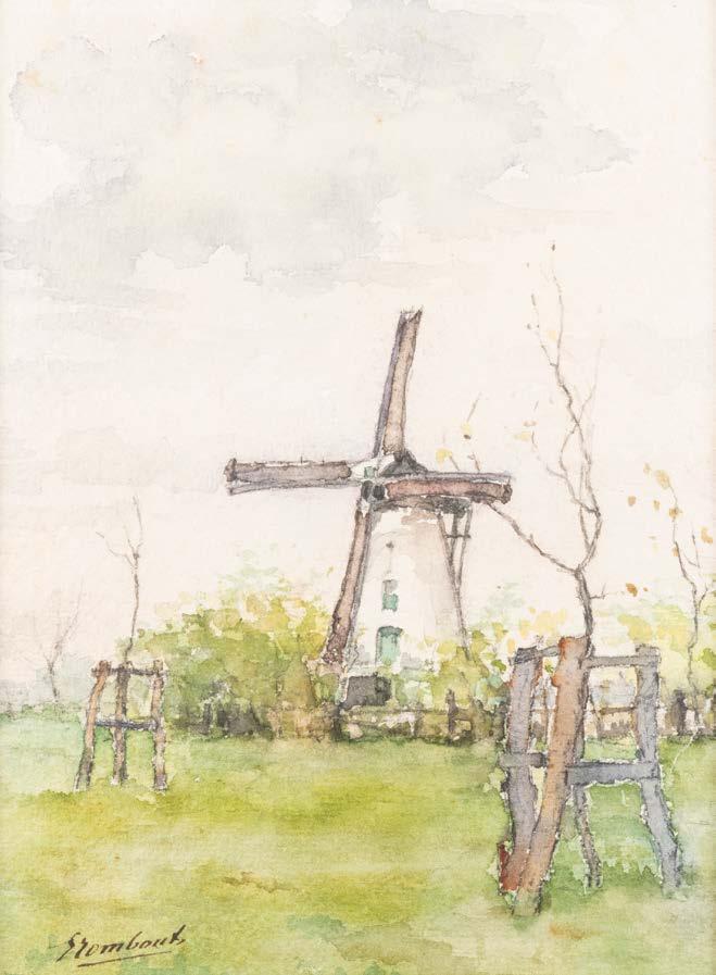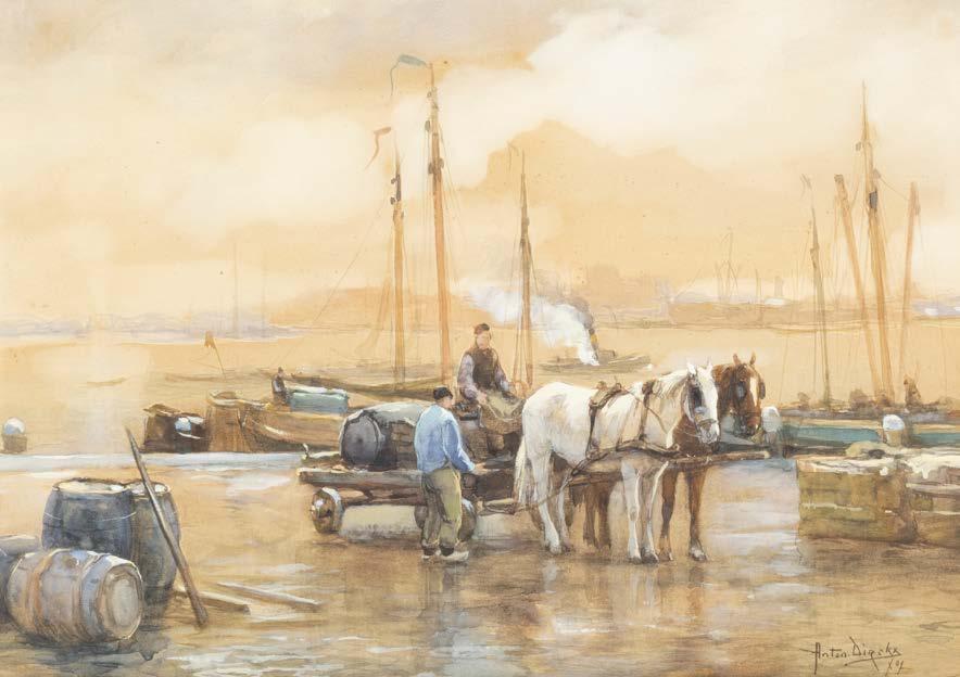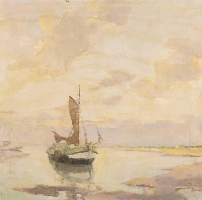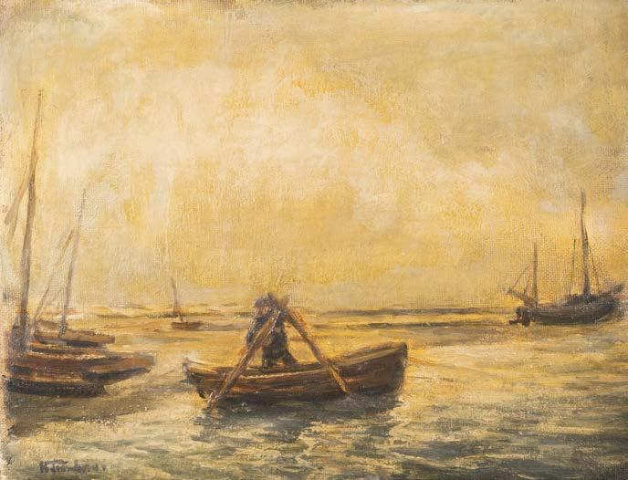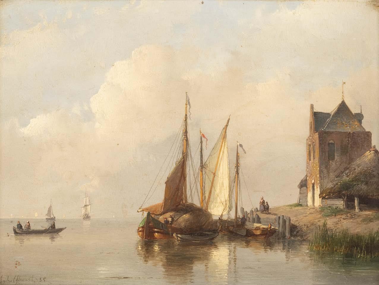 Öl auf Holz. 17 x 22,5 cm (R. 38 x 43 cm). Signiert und datiert unten links ‚A. Schelfhout 55‘. Verso: alter Zettel mit holländischer Inschrift (Eigentumsbestätigung?), schwer leserlich datiert ‚25 october 1855‘, unterschrieben ‚A. Schelfhout‘, sowie Luchtenberg Sammlungsinventarnummer ‚G/n50‘. Leicht verschm. Rahmen. Rechts erhöhtes schilfbewachsenes Seeufer mit Haus und Frau mit Kind; an der Anlegestelle davor haben zwei Segelschiffe (eines mit schwerer Last beladen) festgemacht. Links Ausblick auf die offene See; darauf Ruderkahn und im Hintergrund mehrere Segelschiffe.
