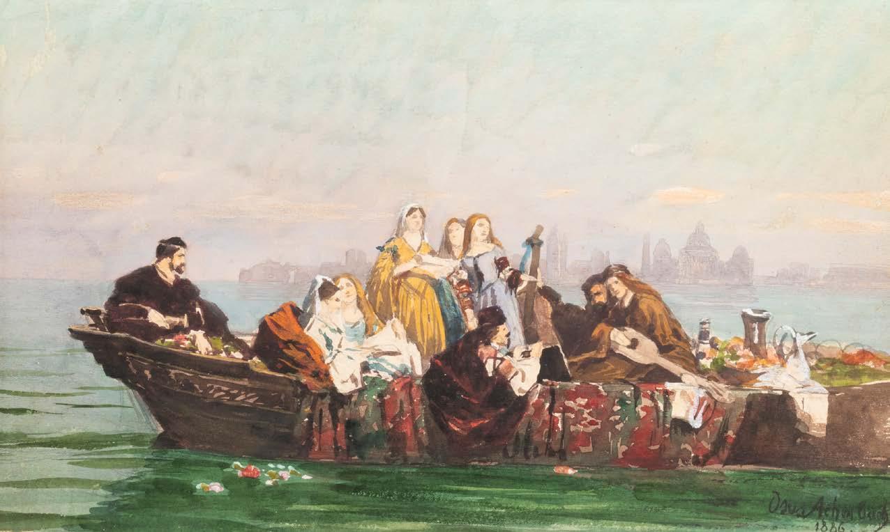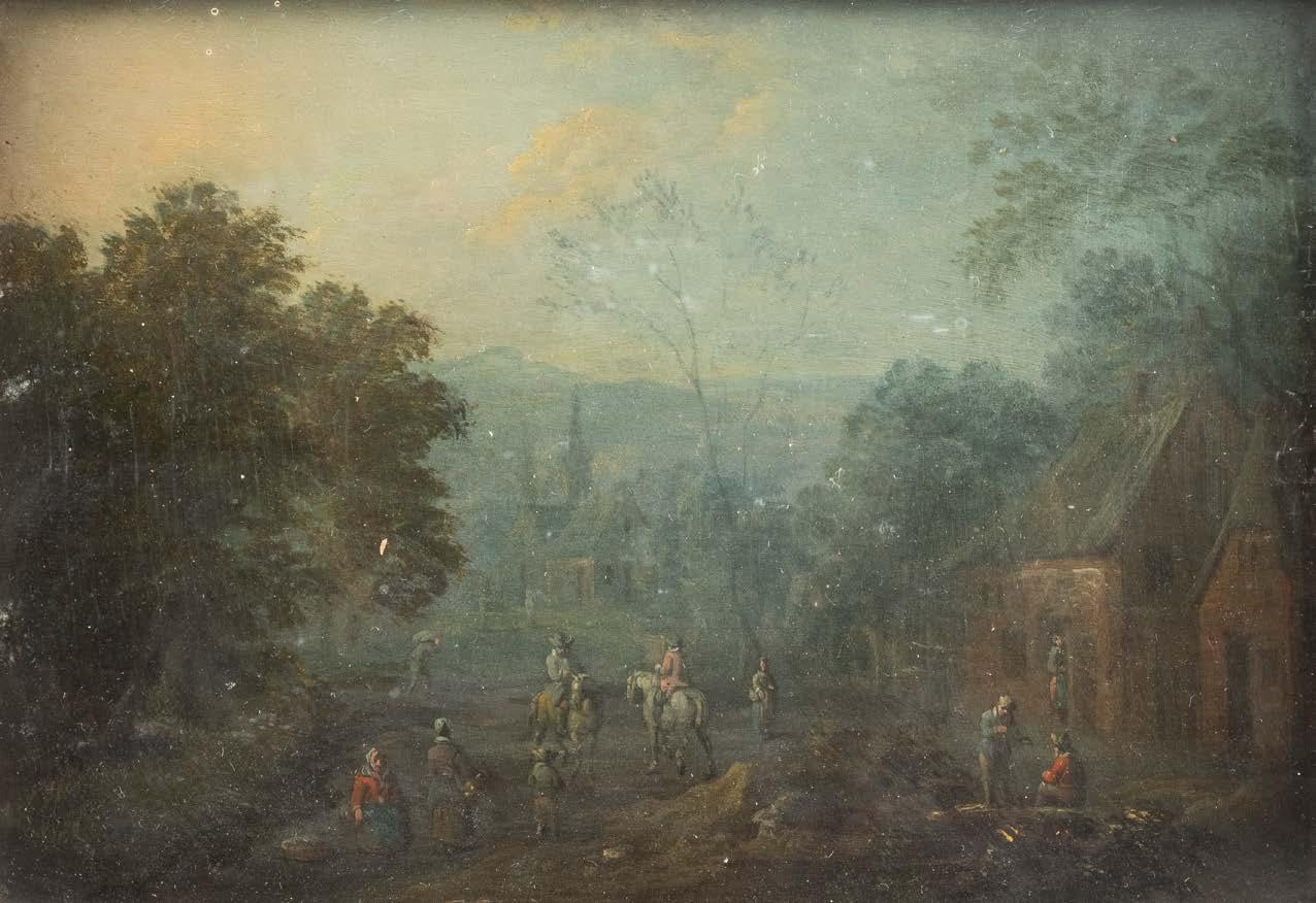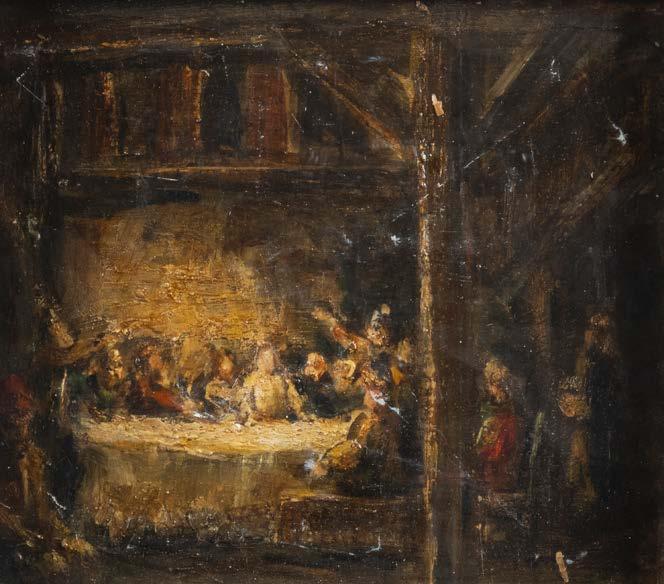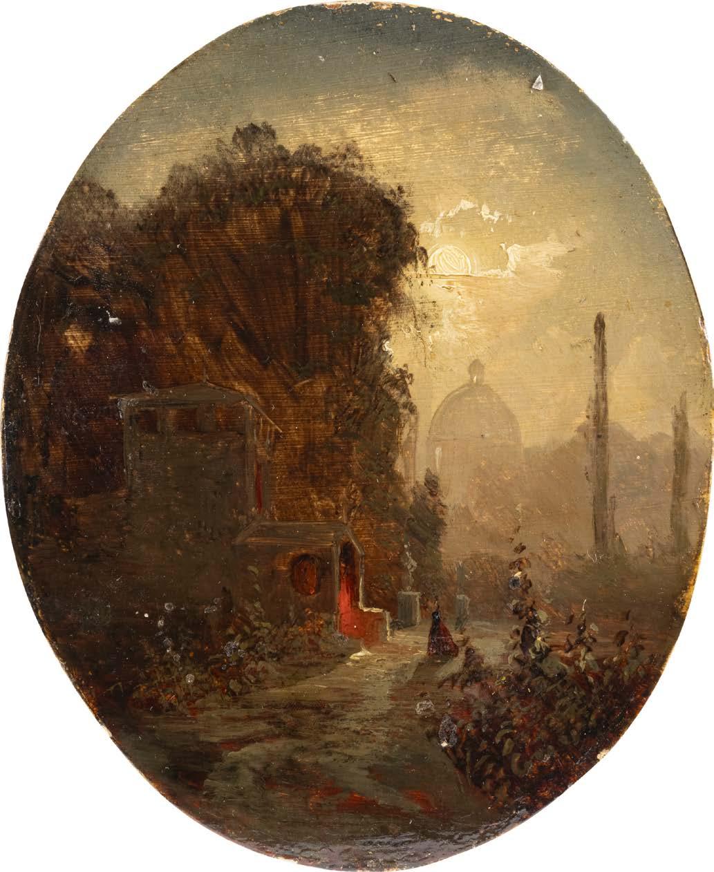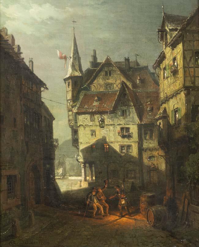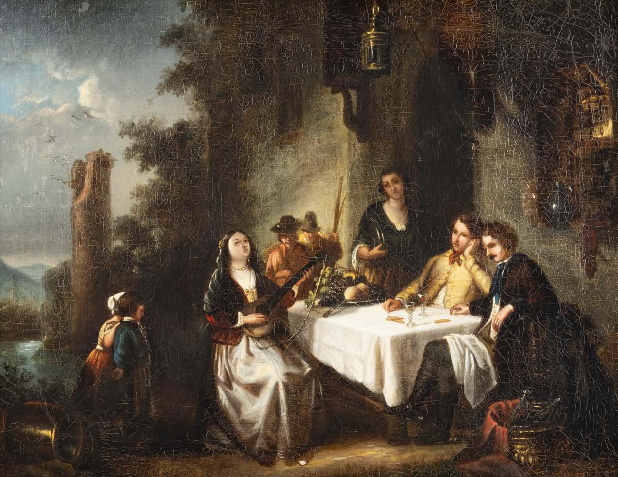Öl auf Leinwand (alt doubl.). 38 x 47 cm (R. 54 x 64 cm). Verso: Aussch. aus altem Versteigerungskatalog oder dgl. mit Beschreibung. Weiterhin Luchtenberg Sammlungsinventarnummer ‚G/n31‘. Rest., Krakelee. Rahmen. Vor verfallenem Schlosse sitzt an einem weiß belegten, mit prächtiger Fruchtschale und Gläsern besetztem Tische eine junge Dame zur Laute singend. Ihrem Gesange lauschen zwei hinter dem Tische sitzende Studenten, die Wirtin, Kinderpaar und zwei andere Figuren. Der von Wolken leicht bedeckte Mond beleuchtet die Gruppe Provenienz: Luchtenberg Stiftung.