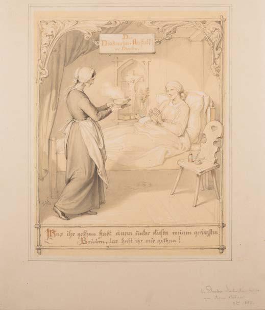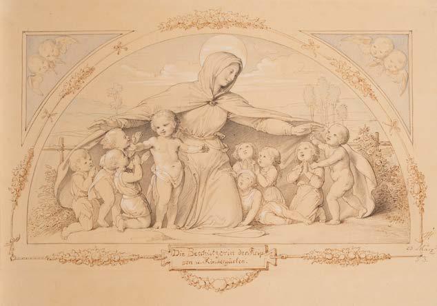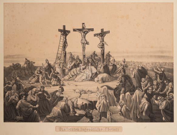 German, 19th century, including Julius Hübner and Ludwig Richter Various techniques: ink and pencil or colored pencil, lithography. Min. sheet size 17 x 11 cm, max. sheet size 26.5 x 37.5 cm. Part. titled, inscribed and dated. Verso Luchtenberg collection inventory number ‚Z/n 27, 28, 39 + D/n 49‘. Motifs: ‚Composition study‘, ‚The protector of crèches and kindergartens‘ (monogr. and dated ‚18 HJH 53‘), ‚The deaconess institution in Dresden‘ (monogr. and dated ‚18 HJH 52‘, ‚The last Moments of Christ‘ (Felgner, Berlin). Browned, stained.
