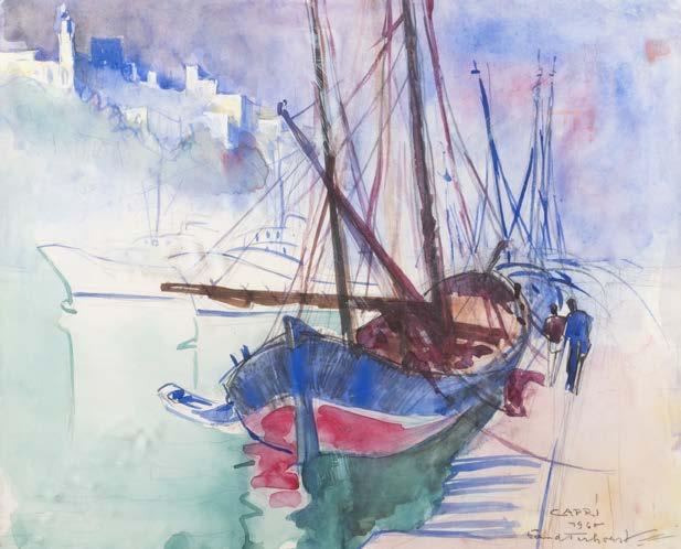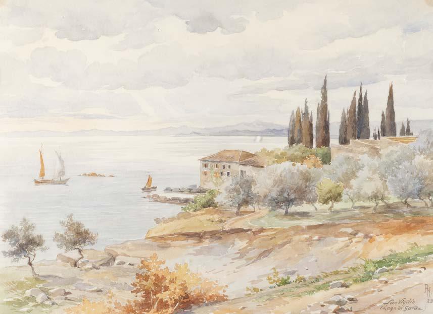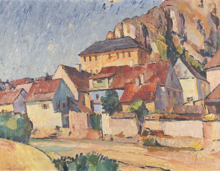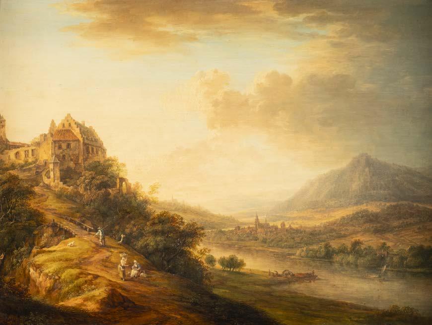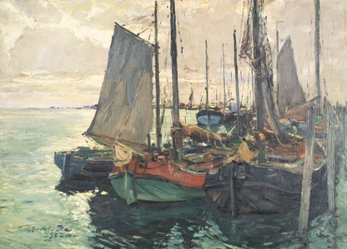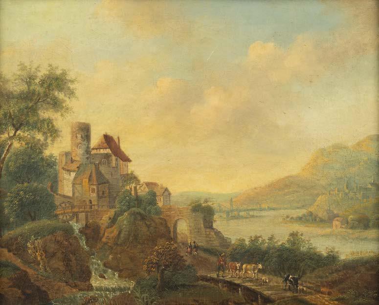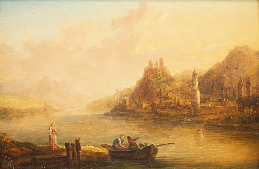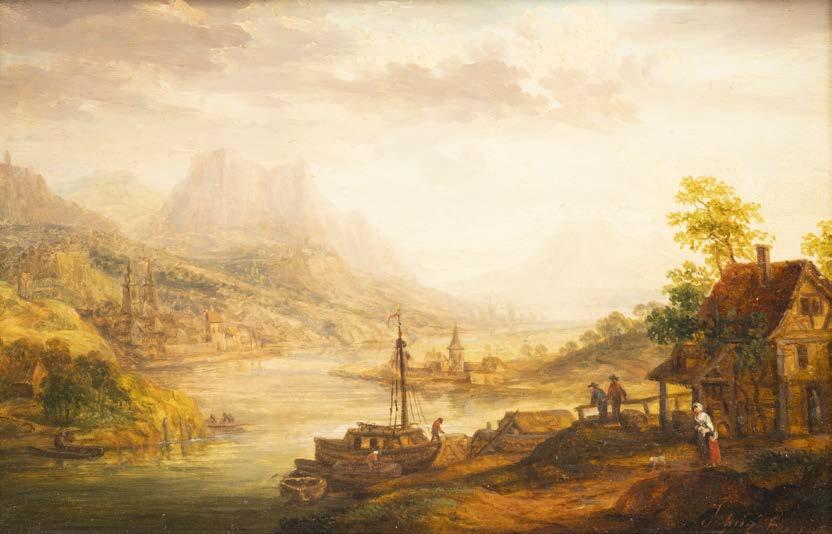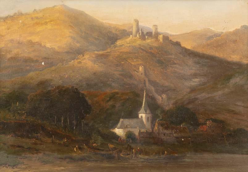 Öl auf Holz. 22 x 33 cm (R. 41 x 50 cm). Signiert unten links ‚Ad. Lasinsky‘. Verso: Luchtenberg Sammlungsinventarnummer ‚G/n42‘. Min. rest., Farbabpl. ca. 0,4 cm. Rahmen. An Flussufer kleines Dorf mit Kirche. Dorfbewohner mit Booten und Fischernetzen beschäftigt. Auf dem das Dorf überragenden Hügel Burgruine, dahinter bergige Landschaft