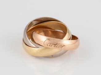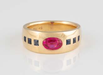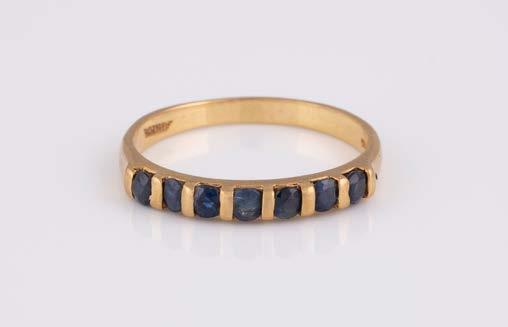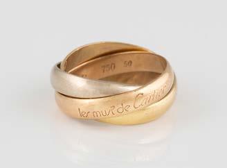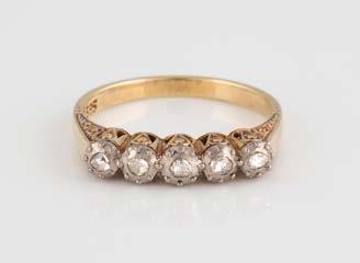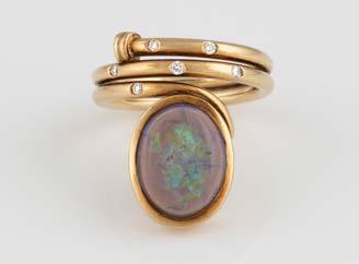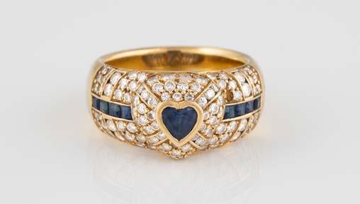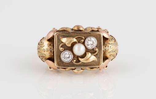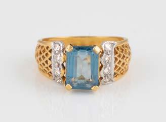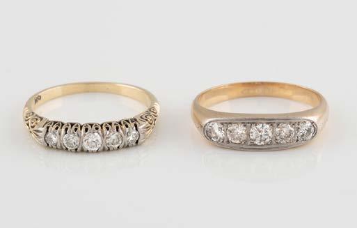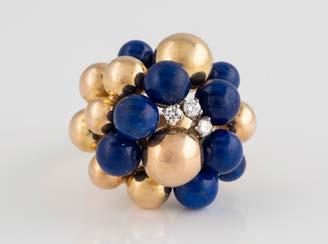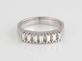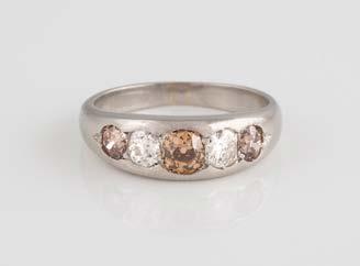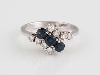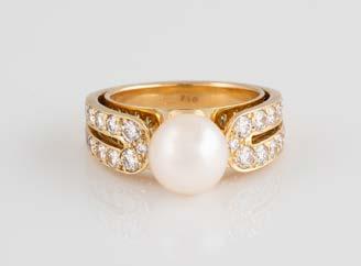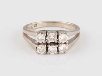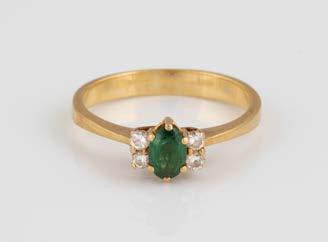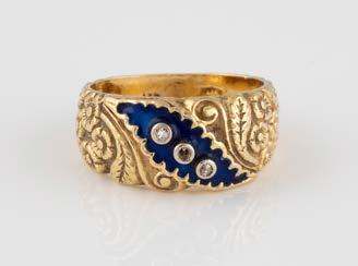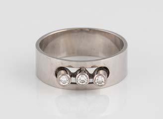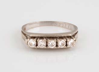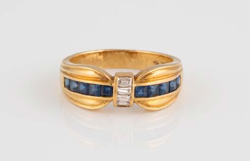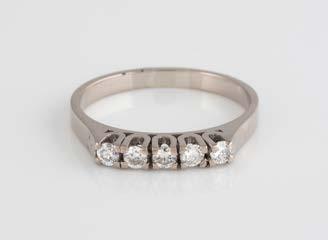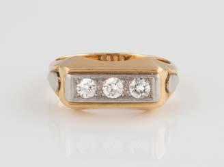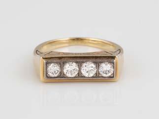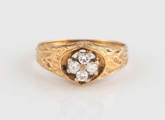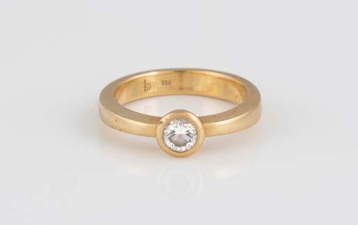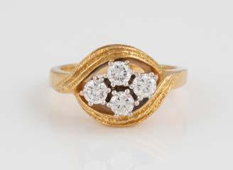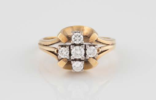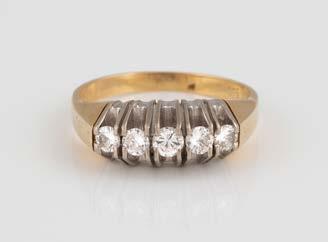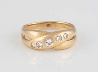 Gelbgold. Ringmaß ca. 60, Ges.-Gew. ca. 6,7. Gest. 750, Herstellersignet ‚HPB‘. Fünf Brillanten, zusammen ca. 0,34 ct.