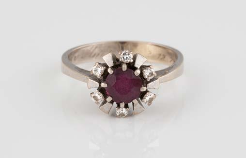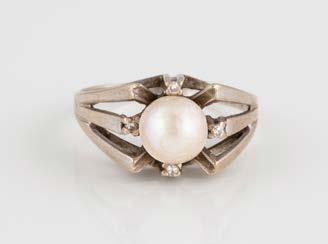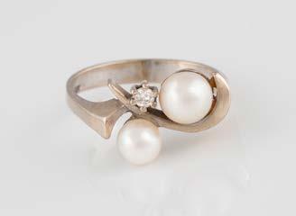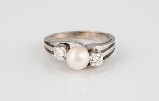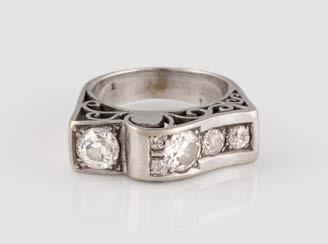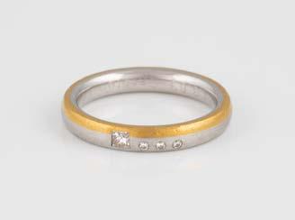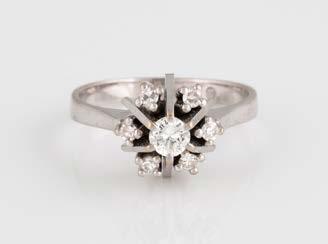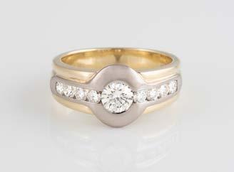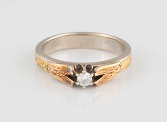Gelbgold, Weißgold. Ringmaß ca. 54, Ges.-Gew. ca. 8,0 g. Gest. 585, Herstellersignet Goldbaur, Bad Wörishofen. Sieben Brillanten, zusammen ca. 0,52 ct.