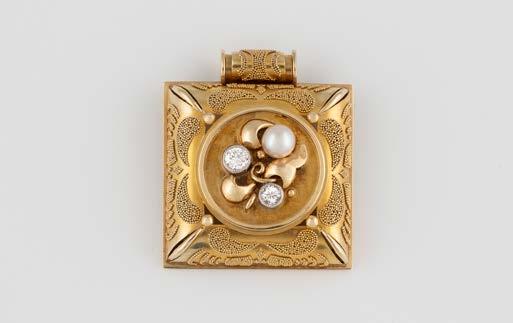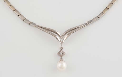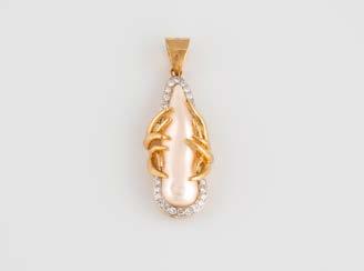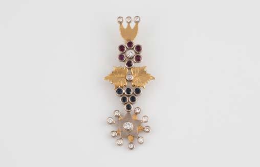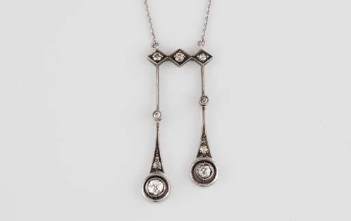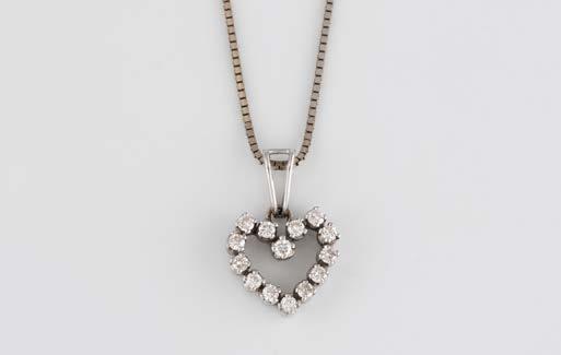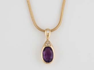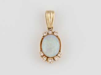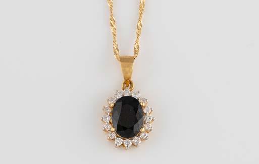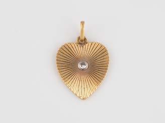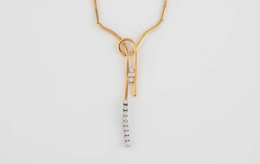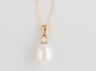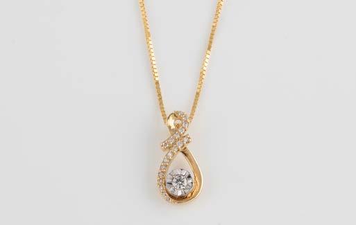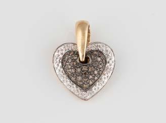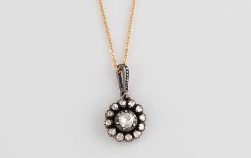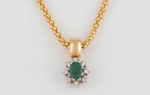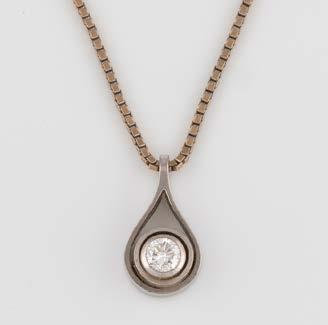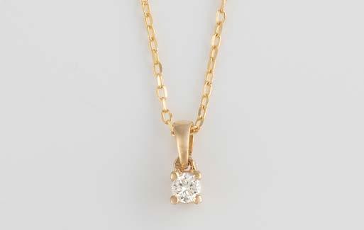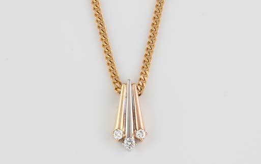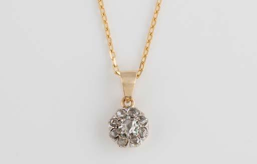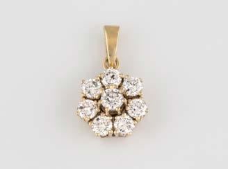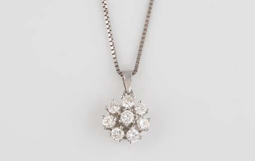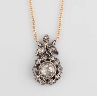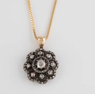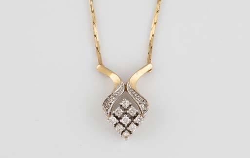 Gelbgold, Weißgold. Anhänger L. 1,6 cm, Kette L. 44,5 cm. Beide gest. 585. Ges-Gew. zus. ca. 7,1 g. Anhänger mit 52 Diamanten, vornehmlich im 8/8-Schliff, zusammen ca. 0,31 ct. Leichte Tragespuren.