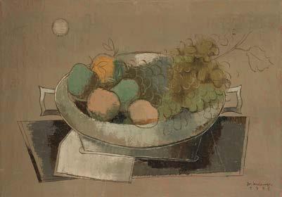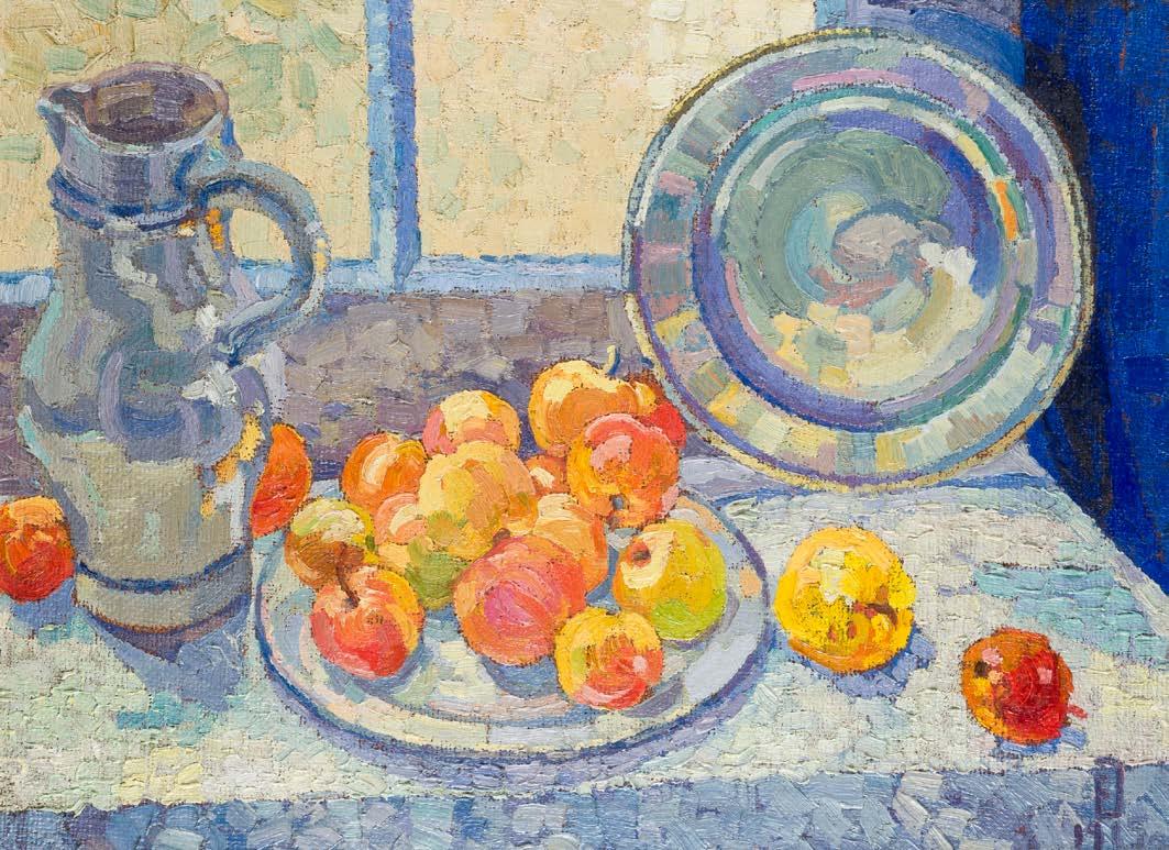 STILLLEBEN MIT KRUG, FRÜCHTEN UND ZINNTELLERN (1915)